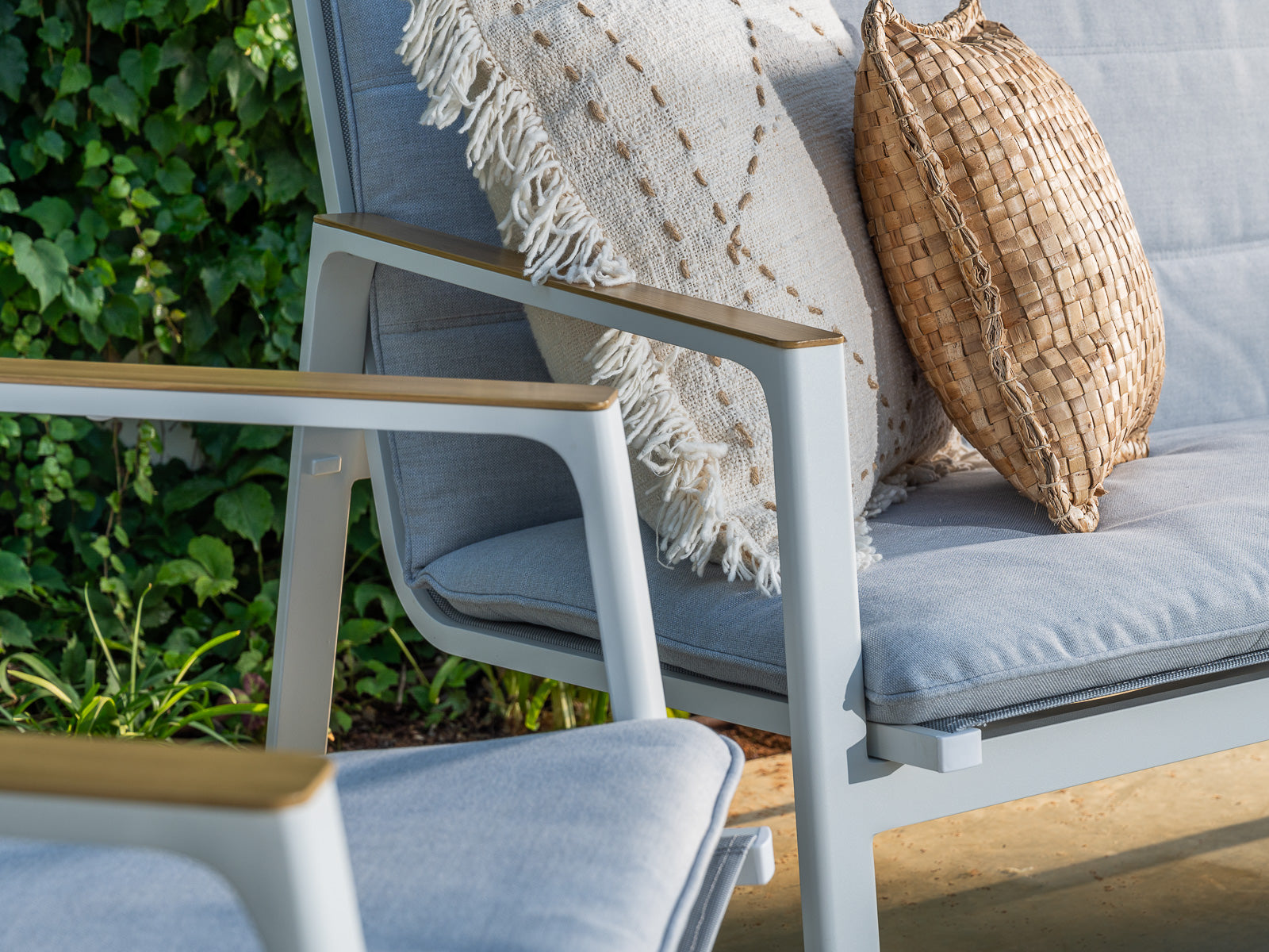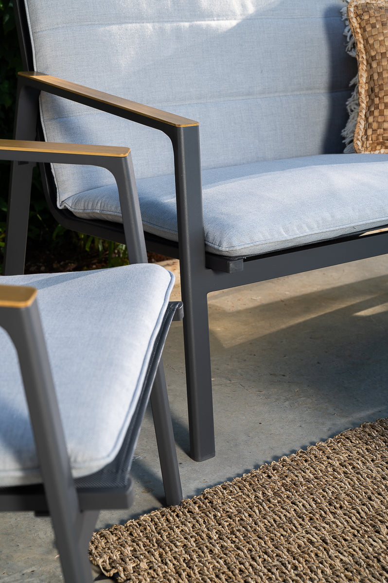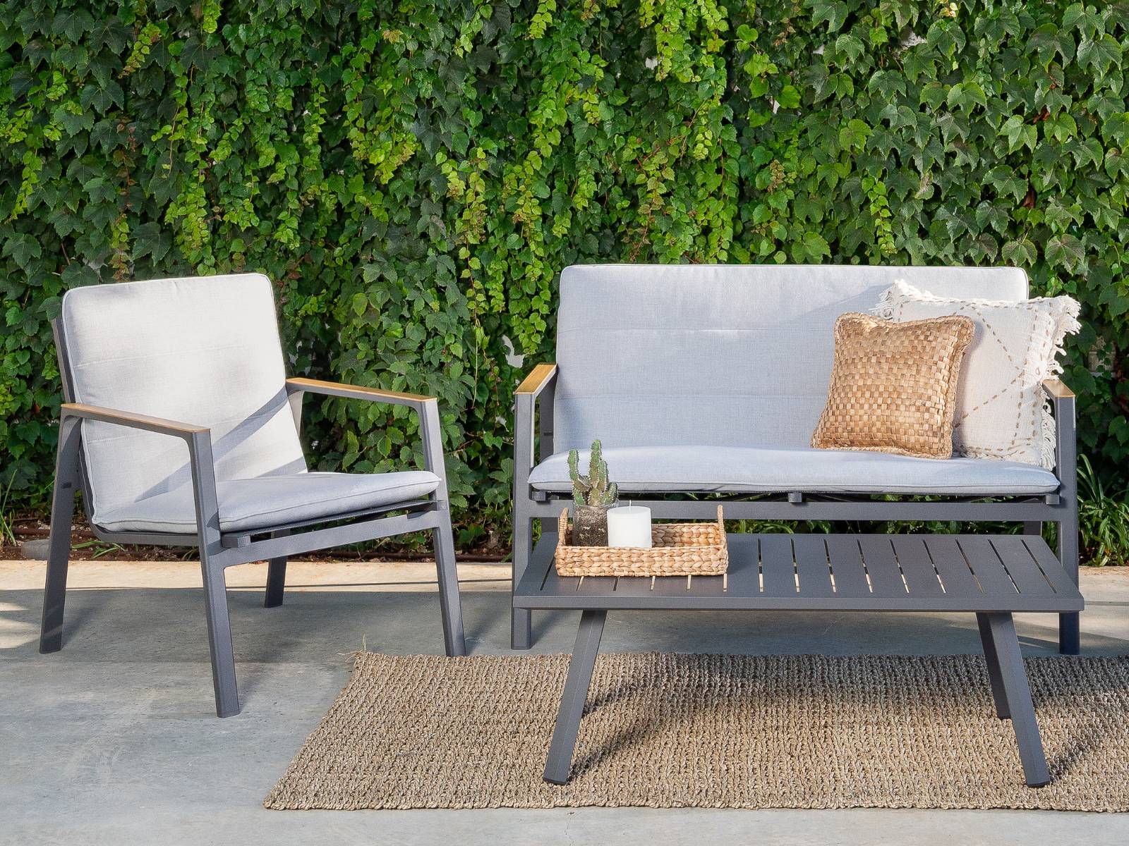 מערכת ישיבה קומפקטית המתאימה במיוחד למרפסות קטנות. מסגרת המערכת והשולחן עשויים אלומיניום איכותי בשילוב ידיות במראה דמוי עץ, כריות מושב וגב עשויות בד חוץ איכותי, עמיד ונעים למגע. קלה לתחזוקה ולטיפול. כוללת: ספה דו מושבית, 2 כורסאות יחיד, שולחן קפה.