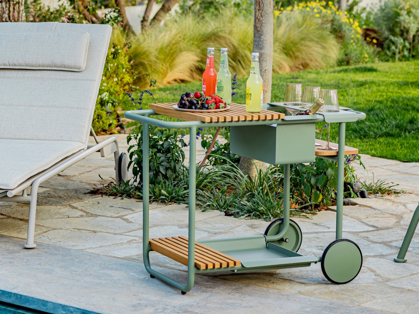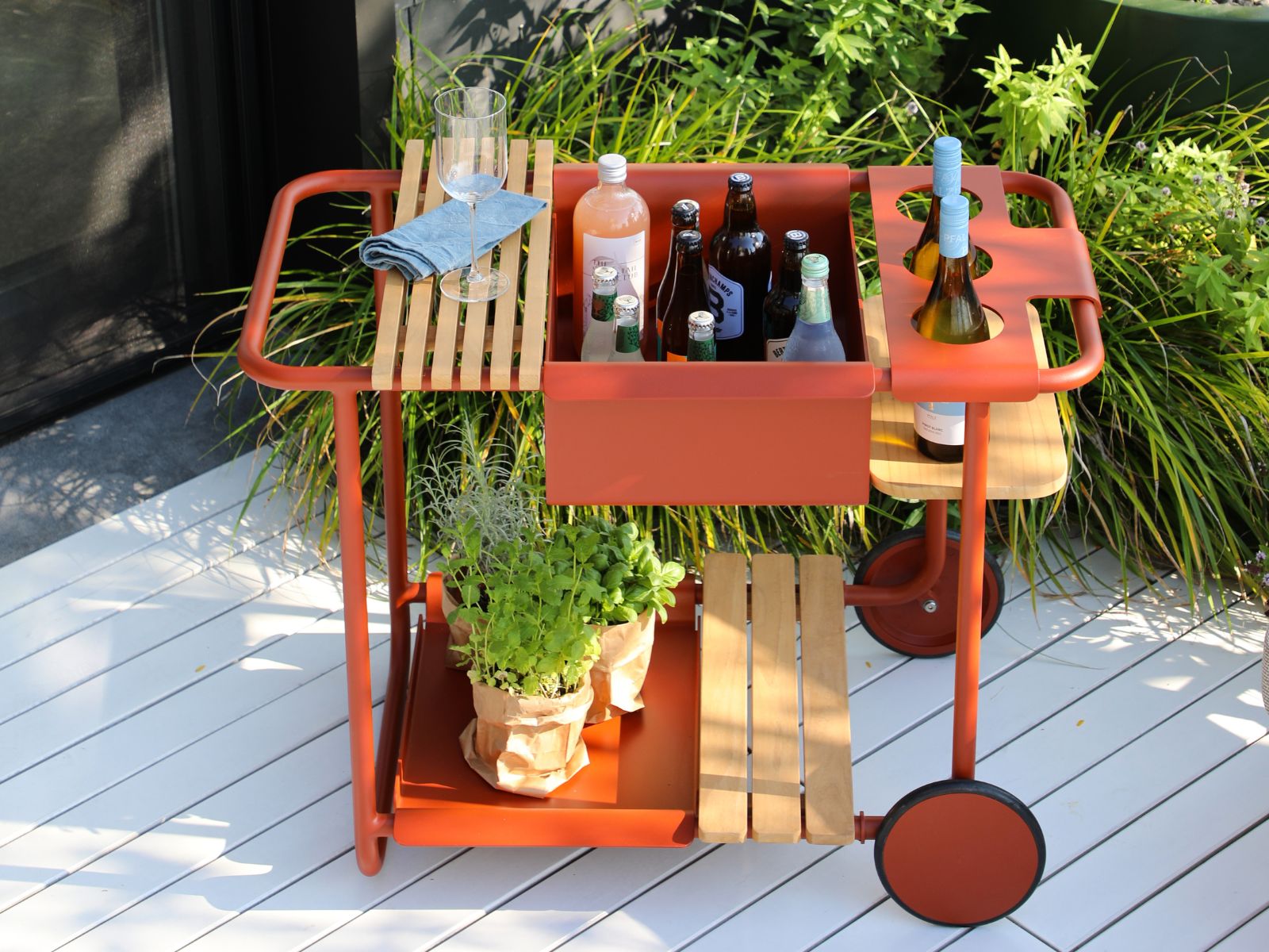 מגשי עץ ומצנן בקבוקים ניתנים לשליפה ומאפשרים למקם אותם בקלות על מסגרת העגלה בהתאם לצרכים שונים.