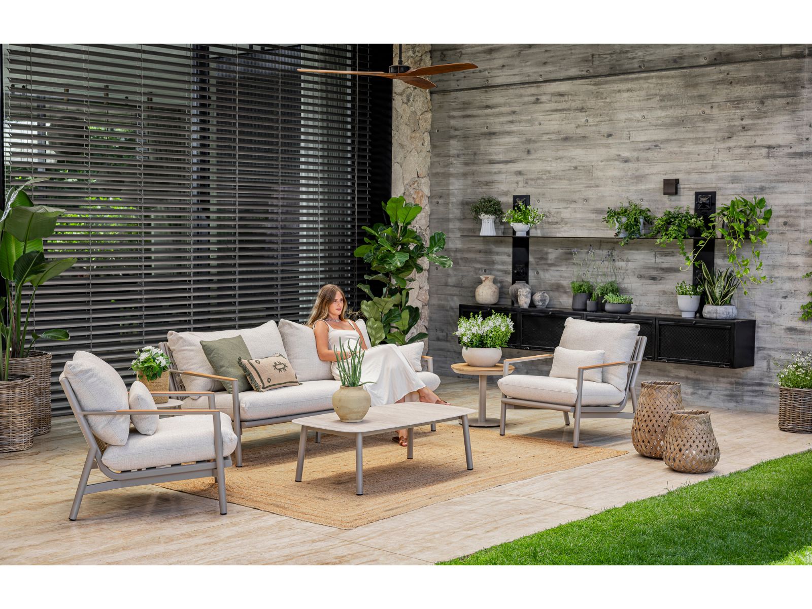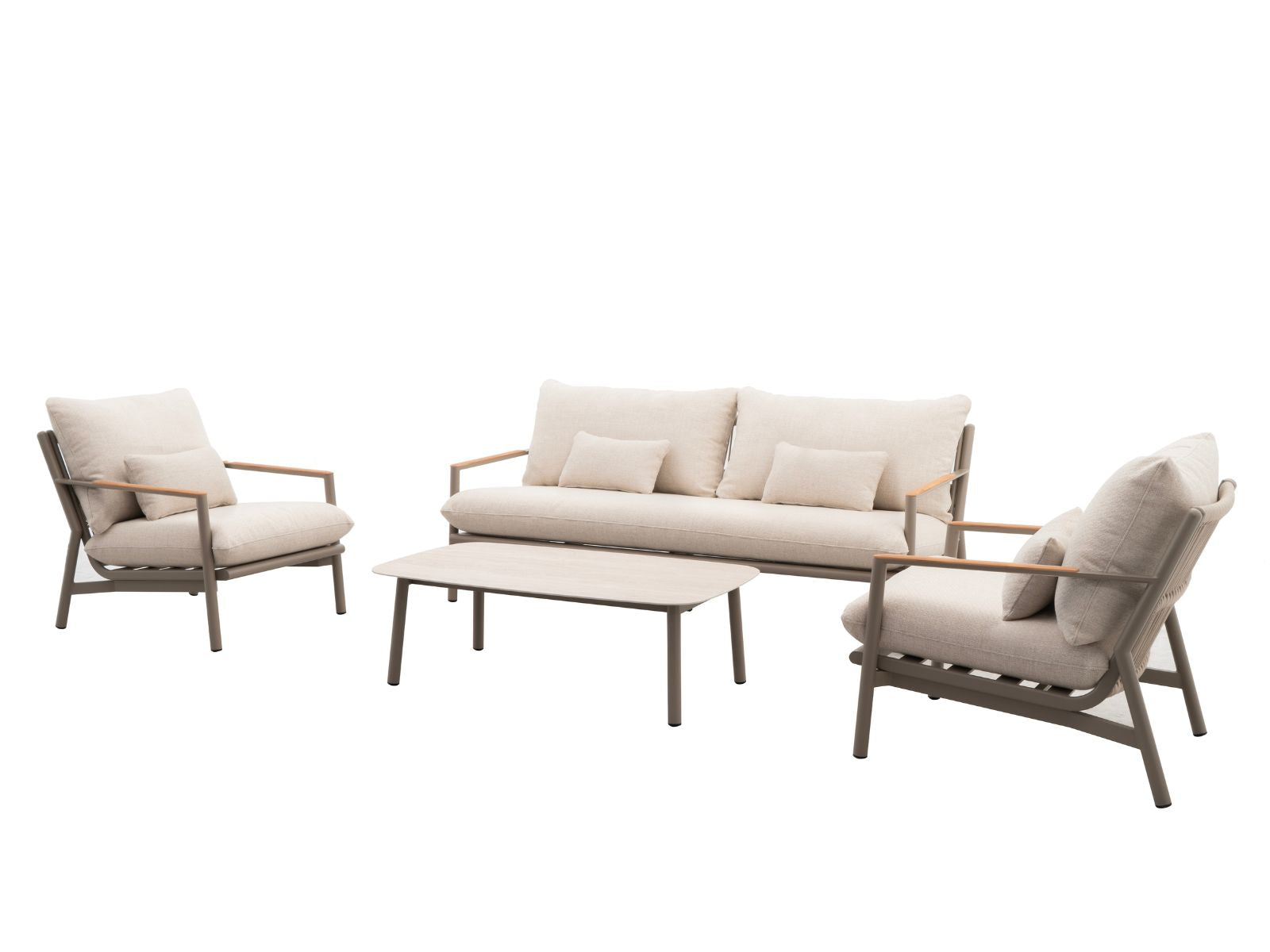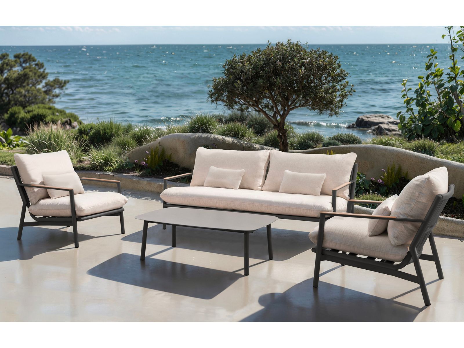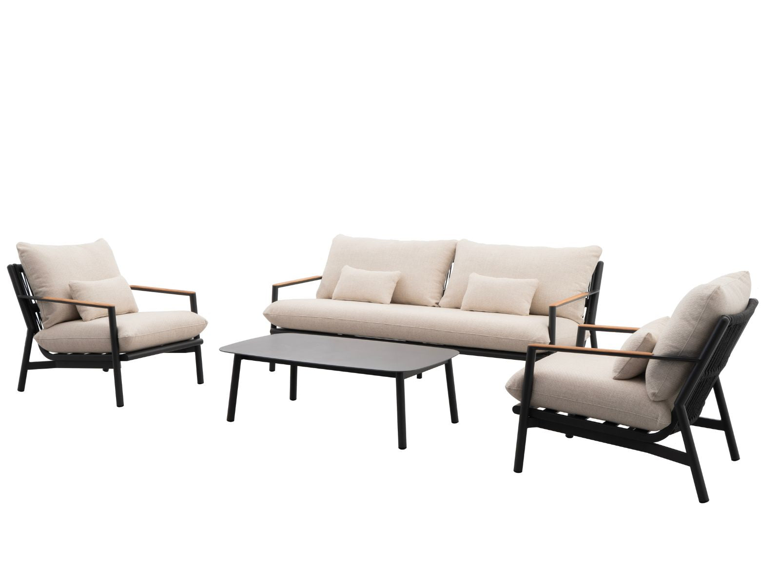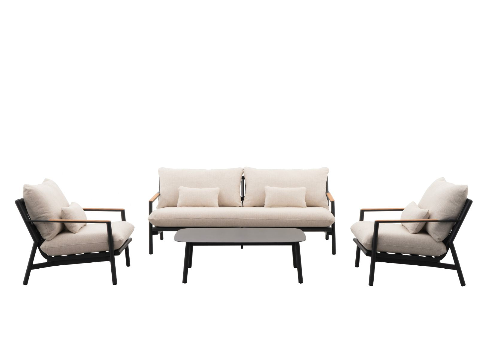 המערכת כוללת: ספה תלת מושבית, 2 כורסאות יחיד, 4 כריות נוי מלבניות, שולחן קפה מלבני עם טופ אבן.