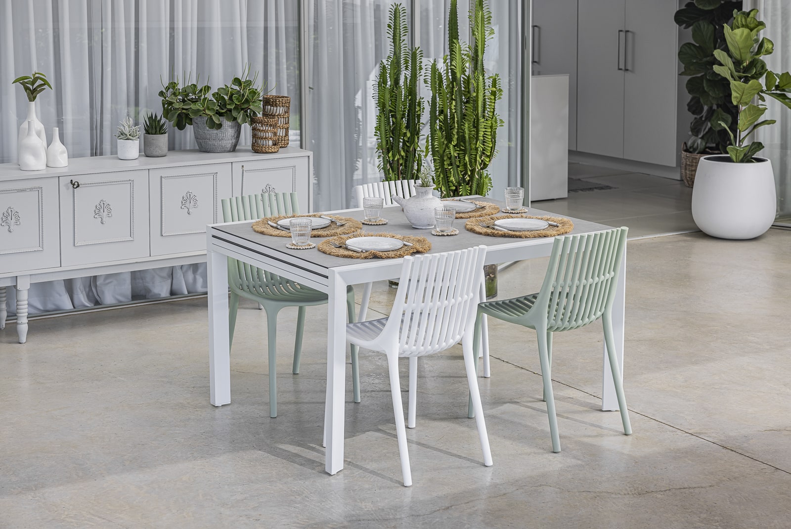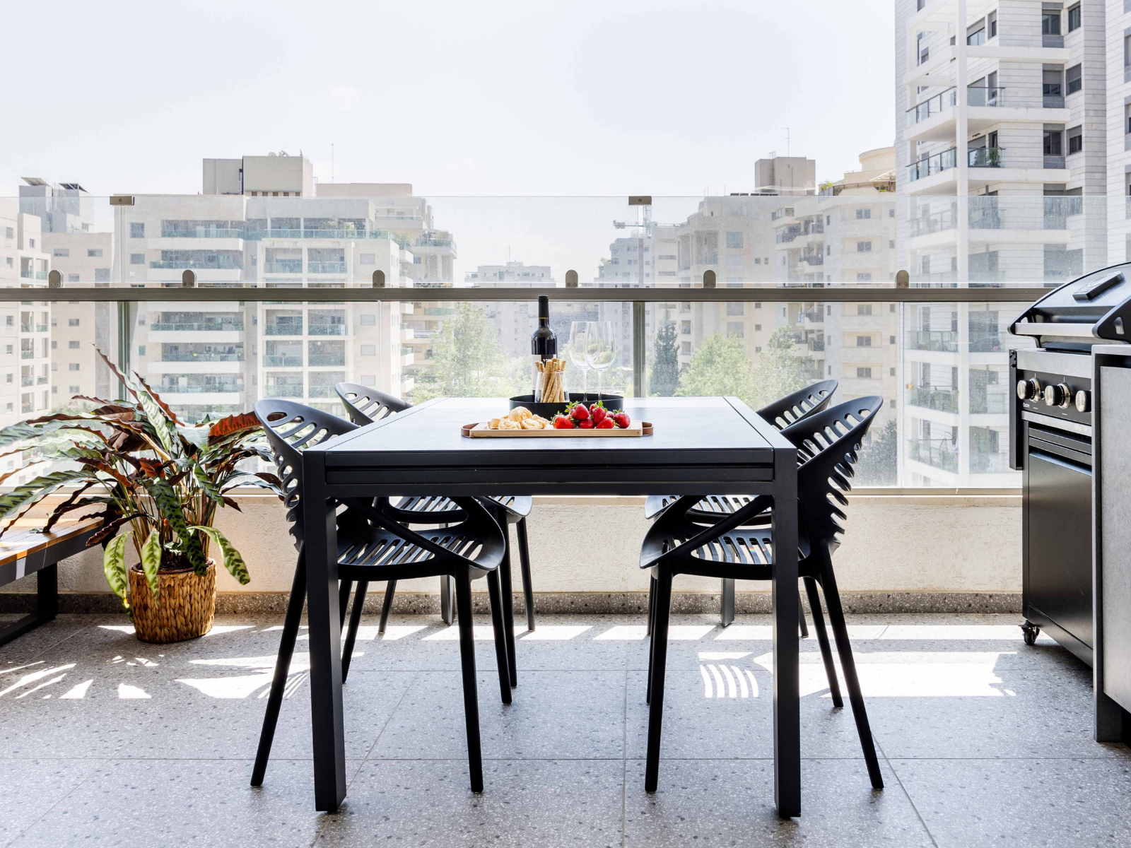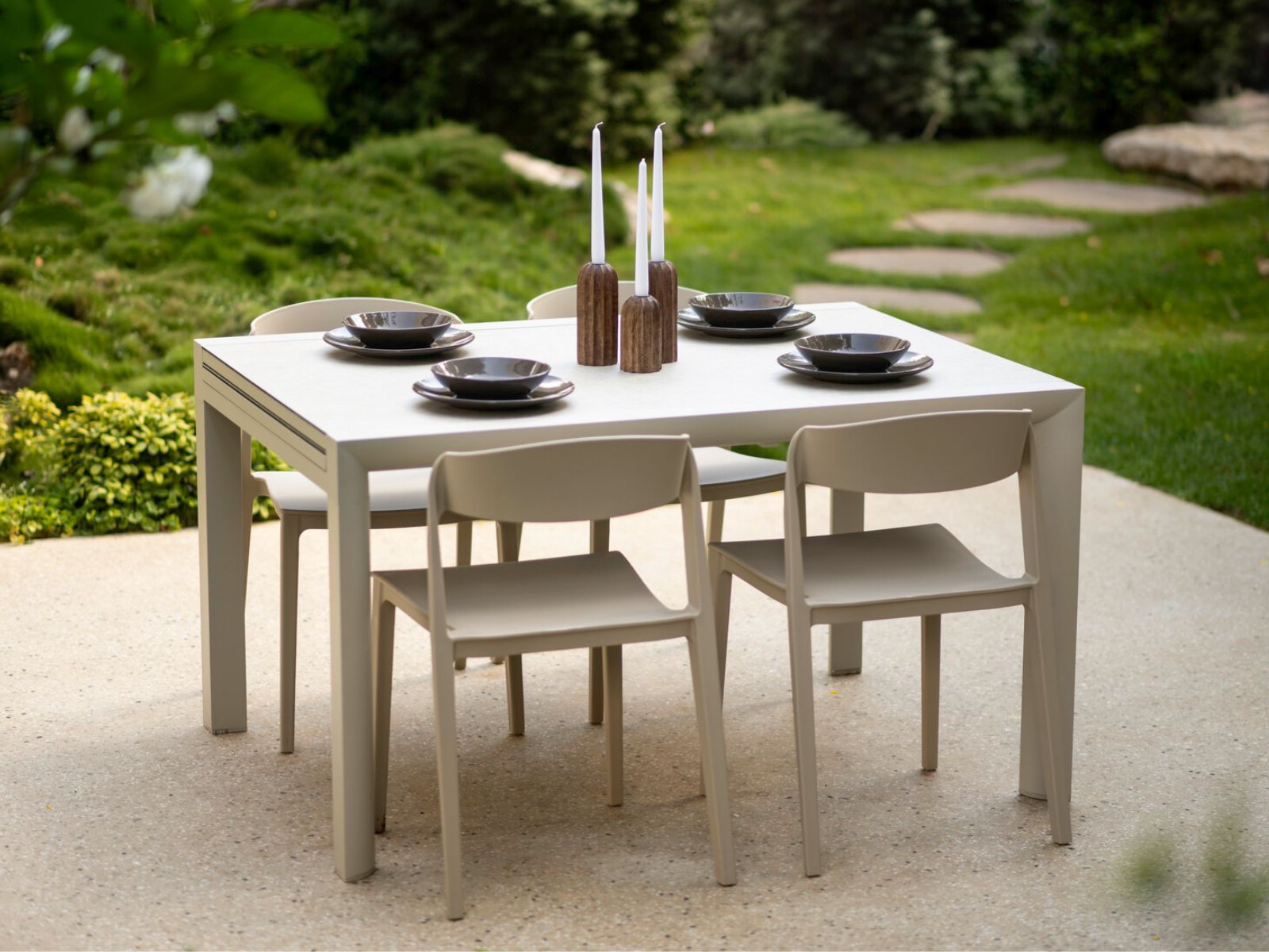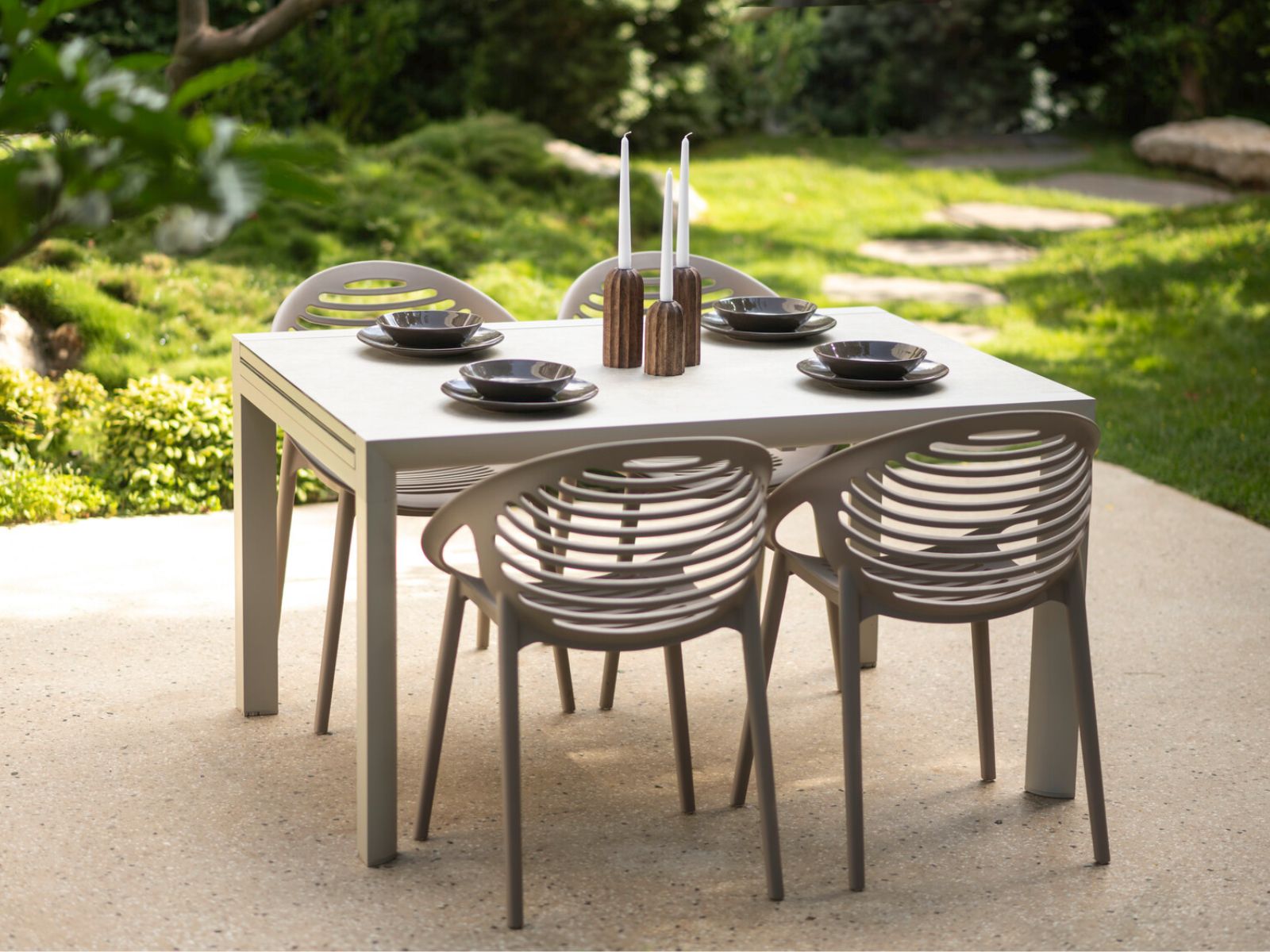 פינת אוכל הכוללת שולחן וכיסאות בעיצוב אלגנטי, מושלמת לאירוח בגינה או במרפסת.