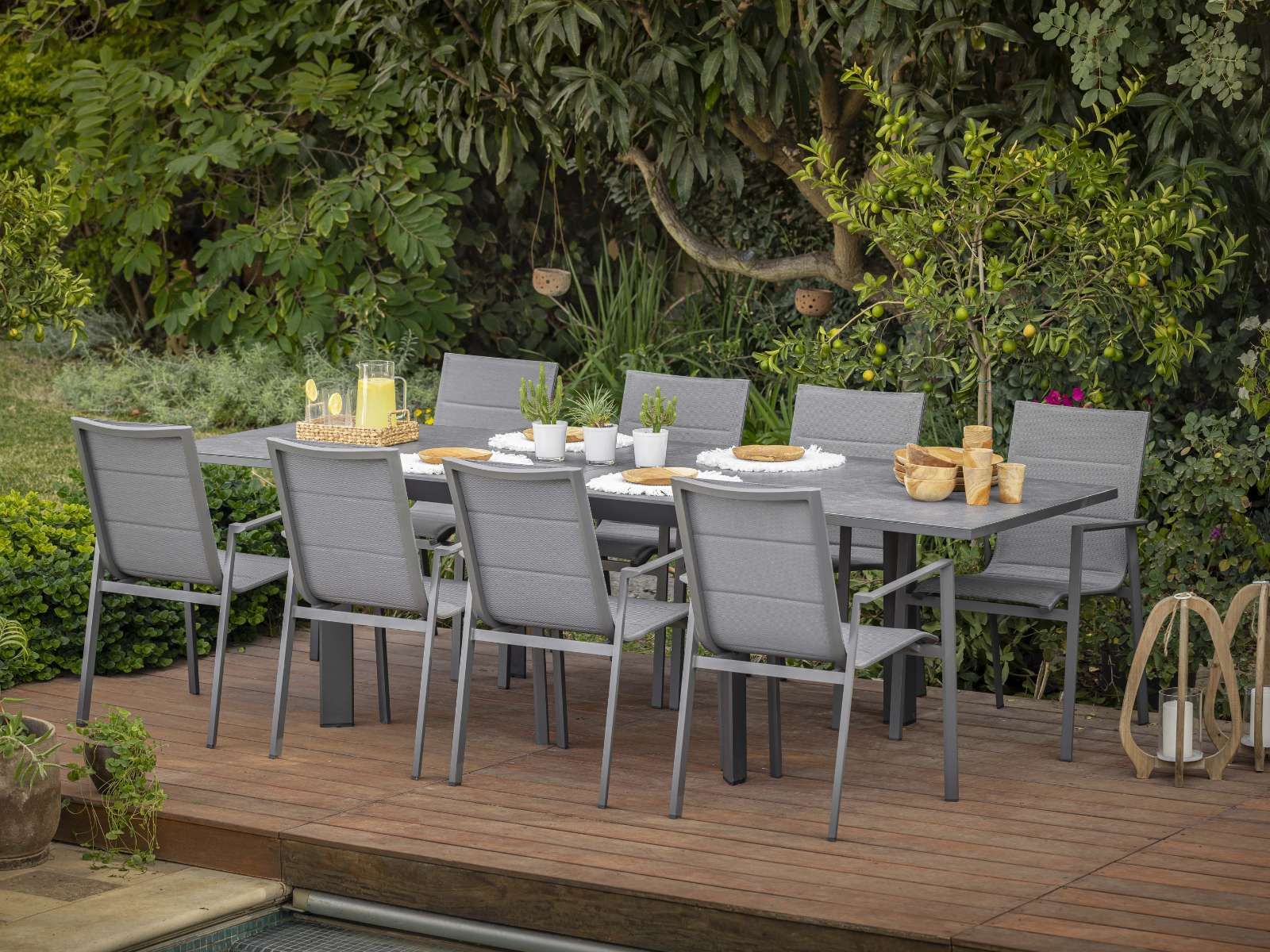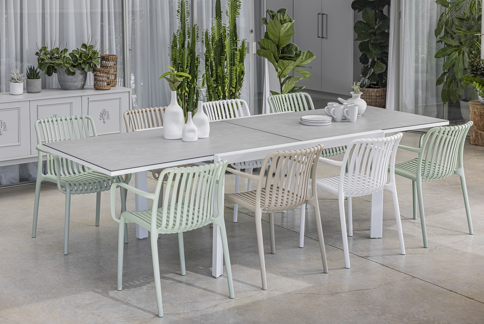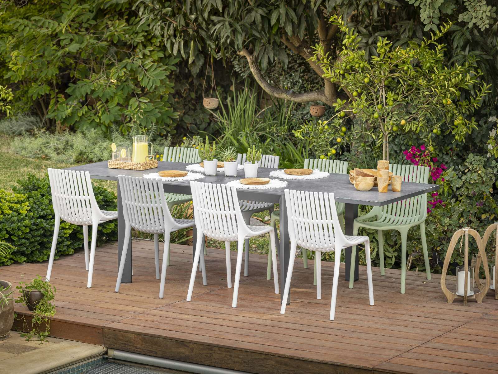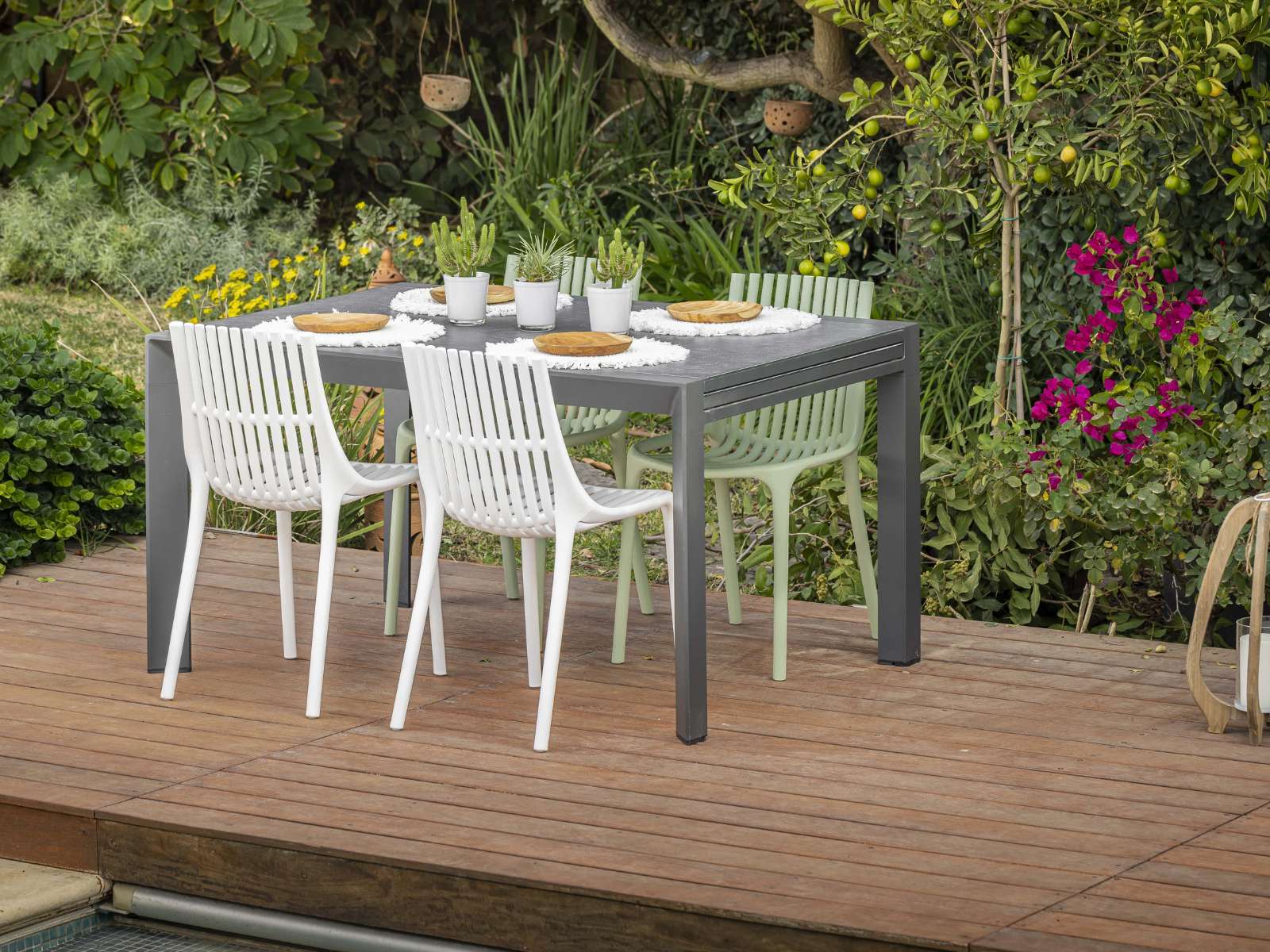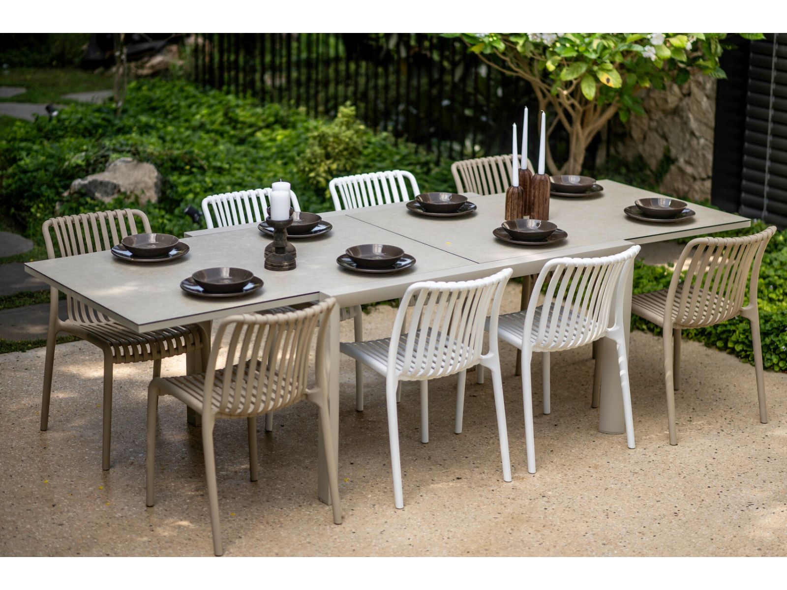 פינת אוכל הכוללת שולחן וכיסאות בעיצוב אלגנטי, מושלמת לאירוח בגינה או במרפסת.