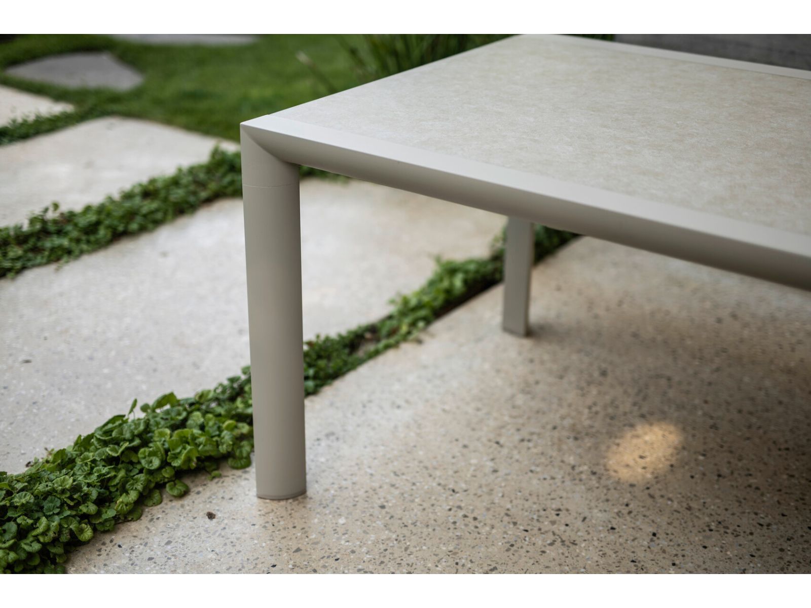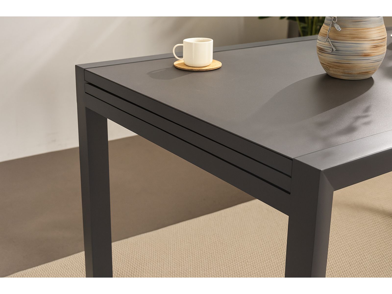 השולחן עשוי אלומיניום עם משטח זכוכית עליון במראה דמוי שיש, פרקטי קל לניקוי והזזה, בעל מנגנון פתיחה נח לתפעול.