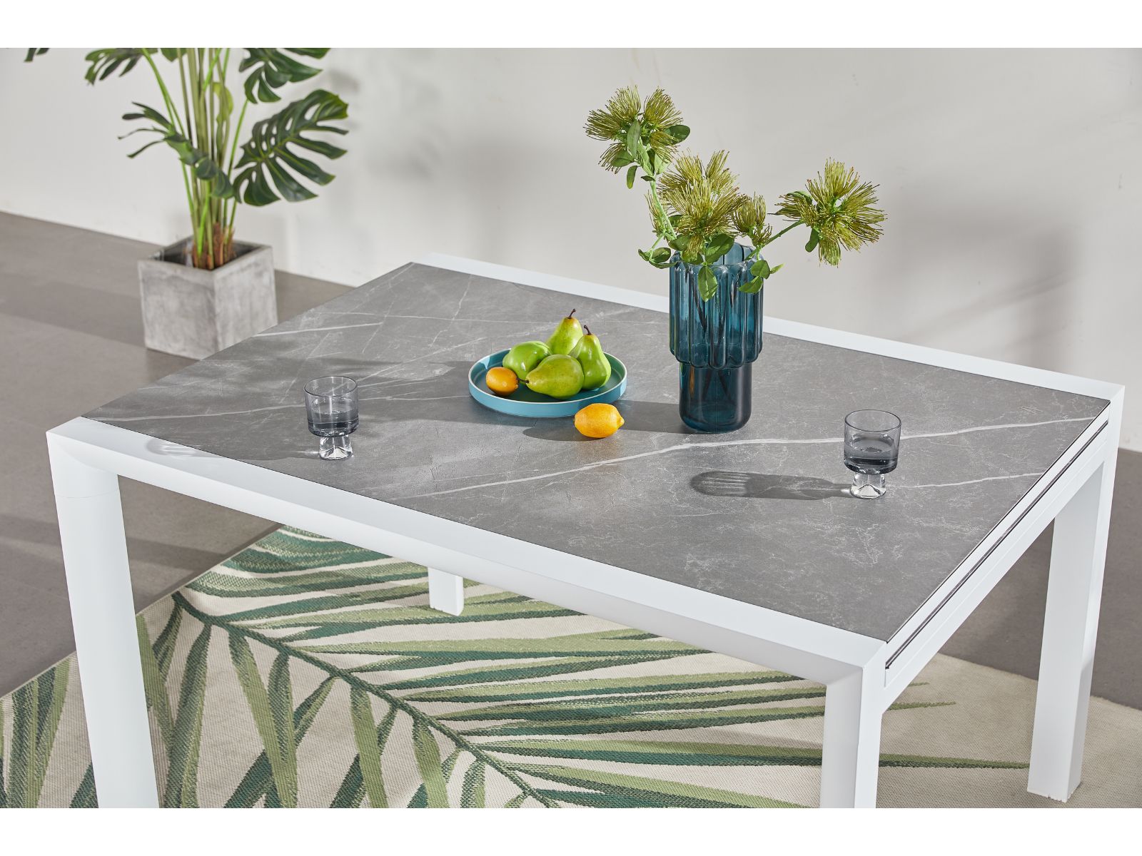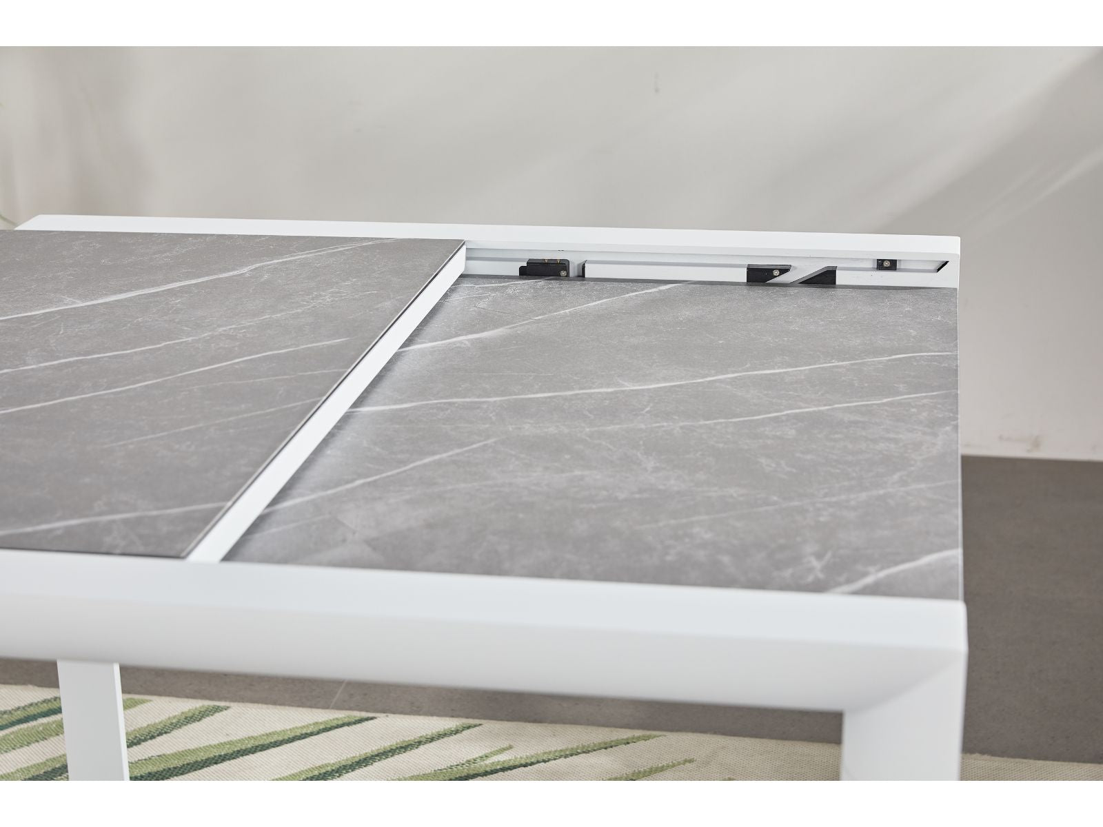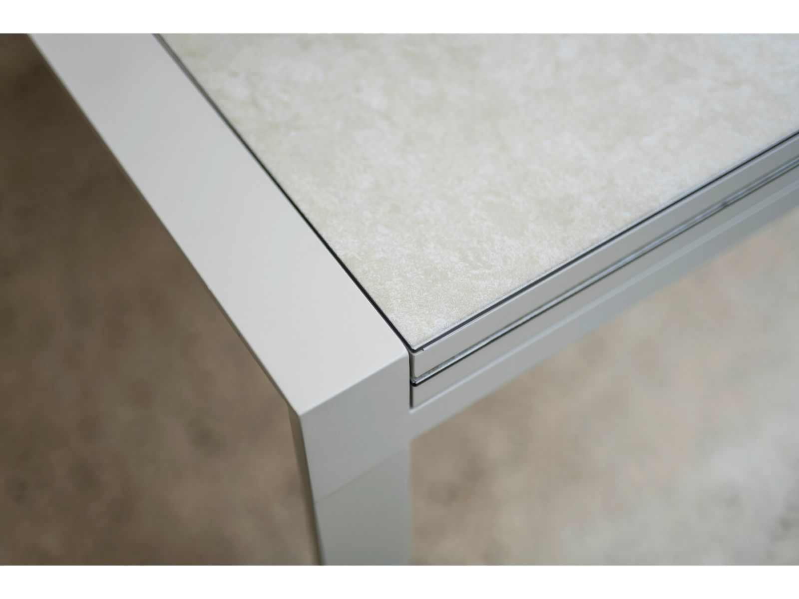 השולחן עשוי אלומיניום עם משטח זכוכית עליון במראה דמוי שיש, פרקטי קל לניקוי והזזה, בעל מנגנון פתיחה נח לתפעול.