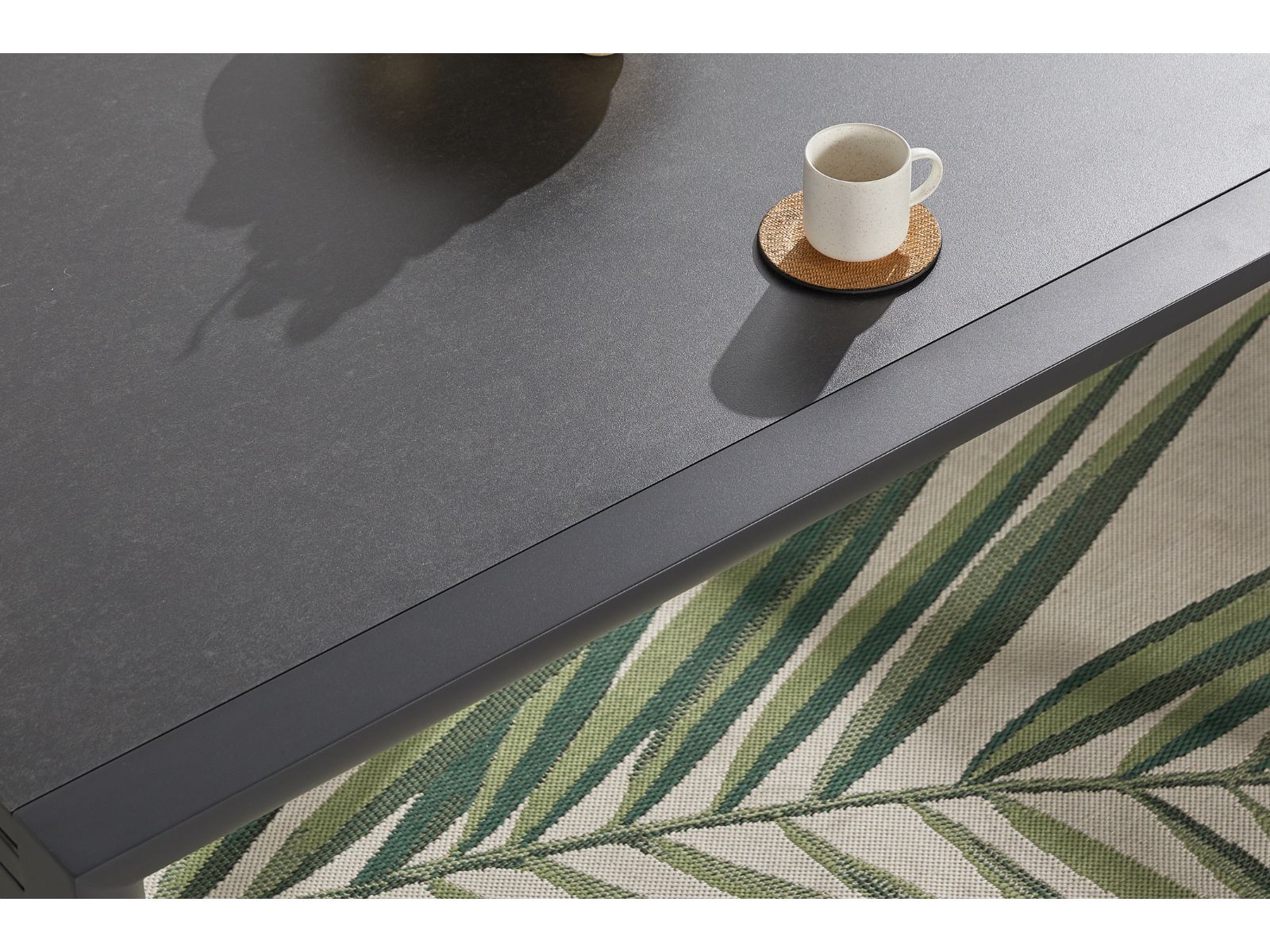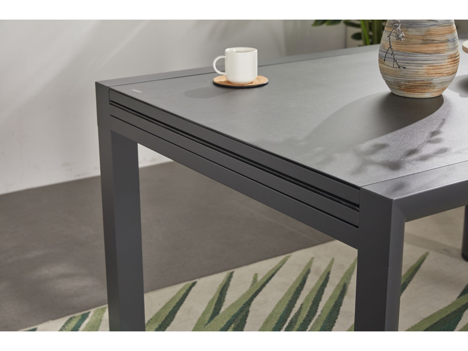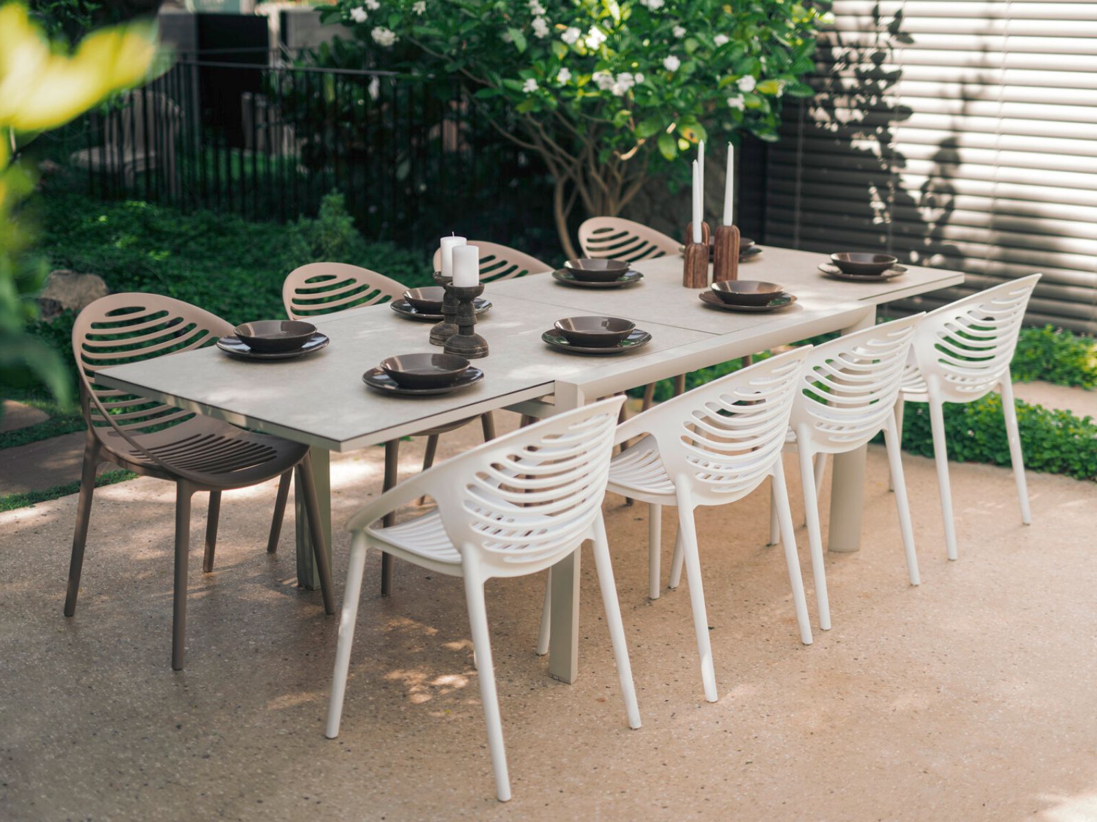 שולחן אוכל בעיצוב אלגנטי, מושלם לאירוח בגינה או במרפסת.