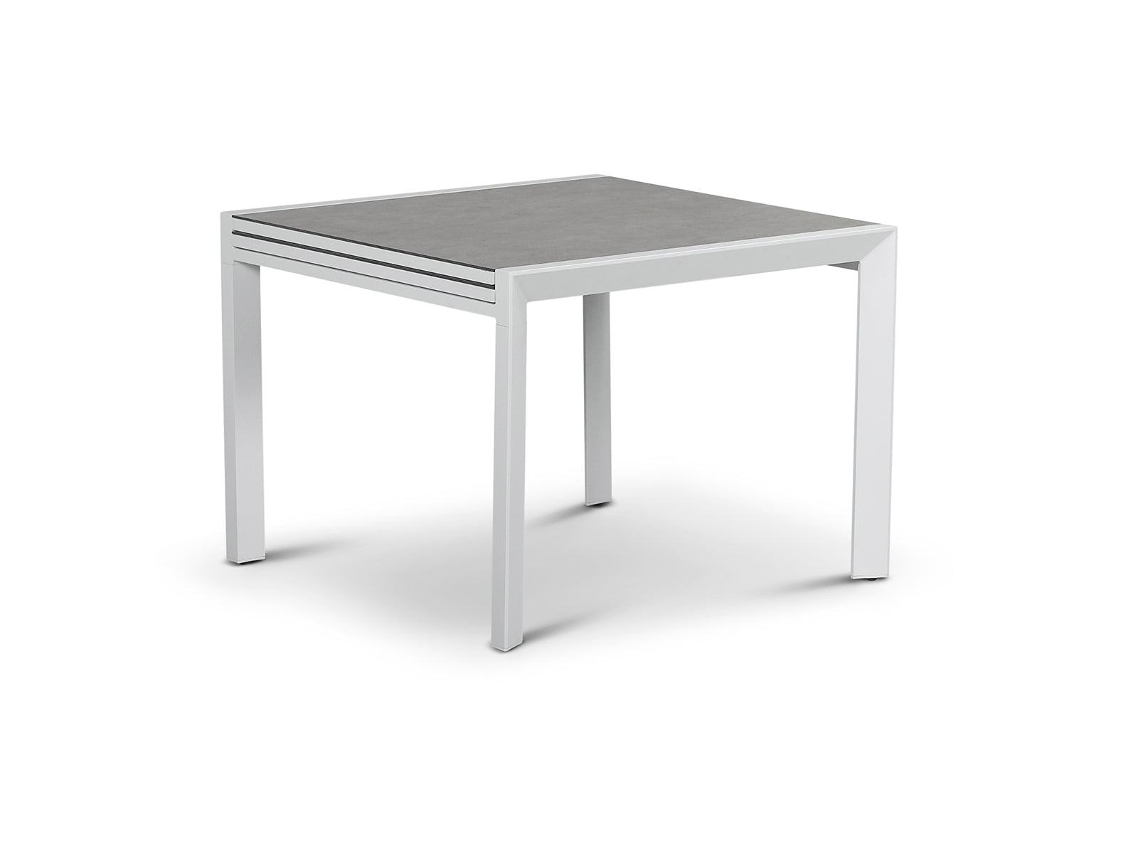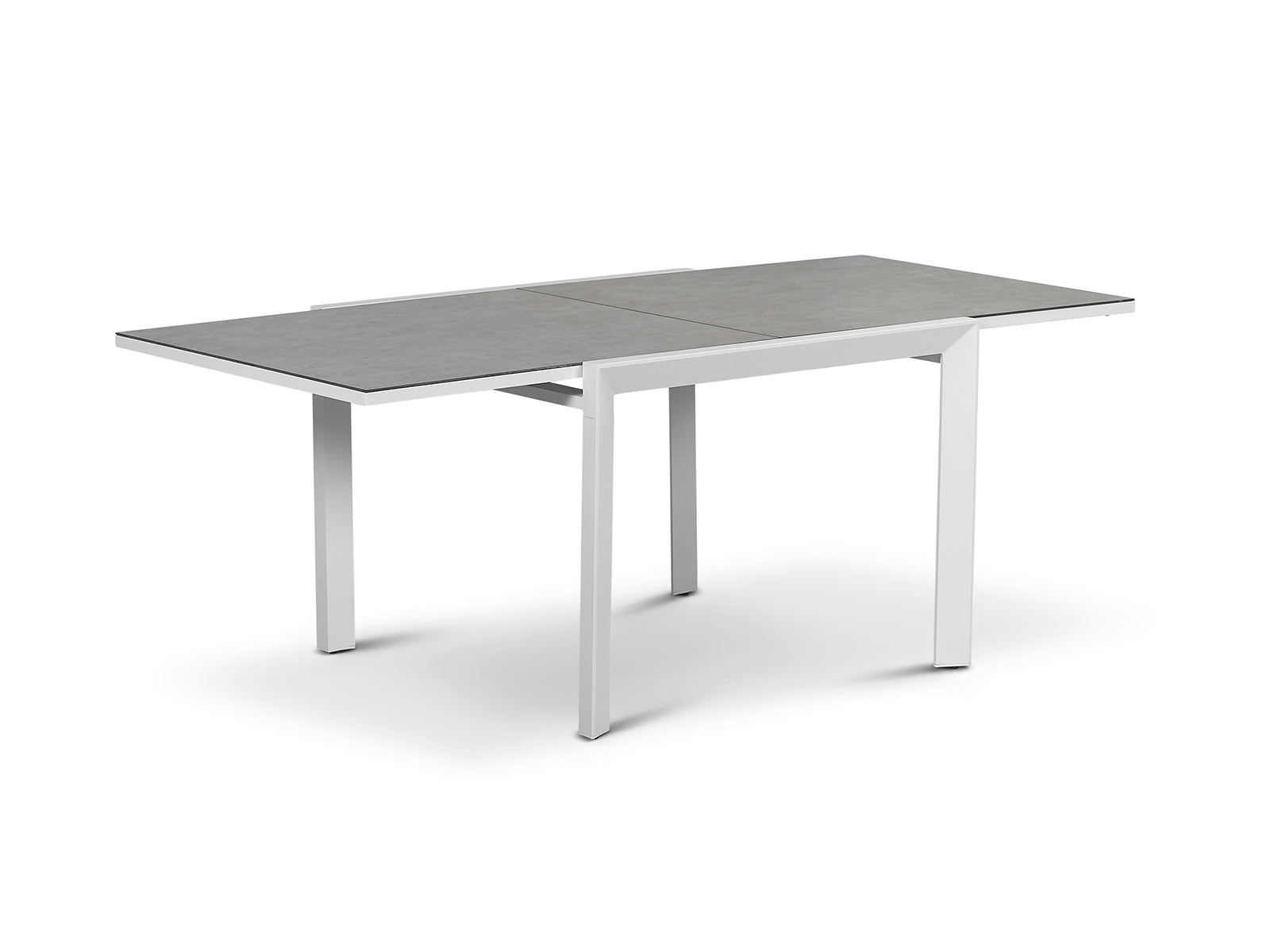 השולחן עשוי אלומיניום עם משטח זכוכית עליון במראה דמוי שיש, פרקטי קל לניקוי והזזה, בעל מנגנון פתיחה נח לתפעול.