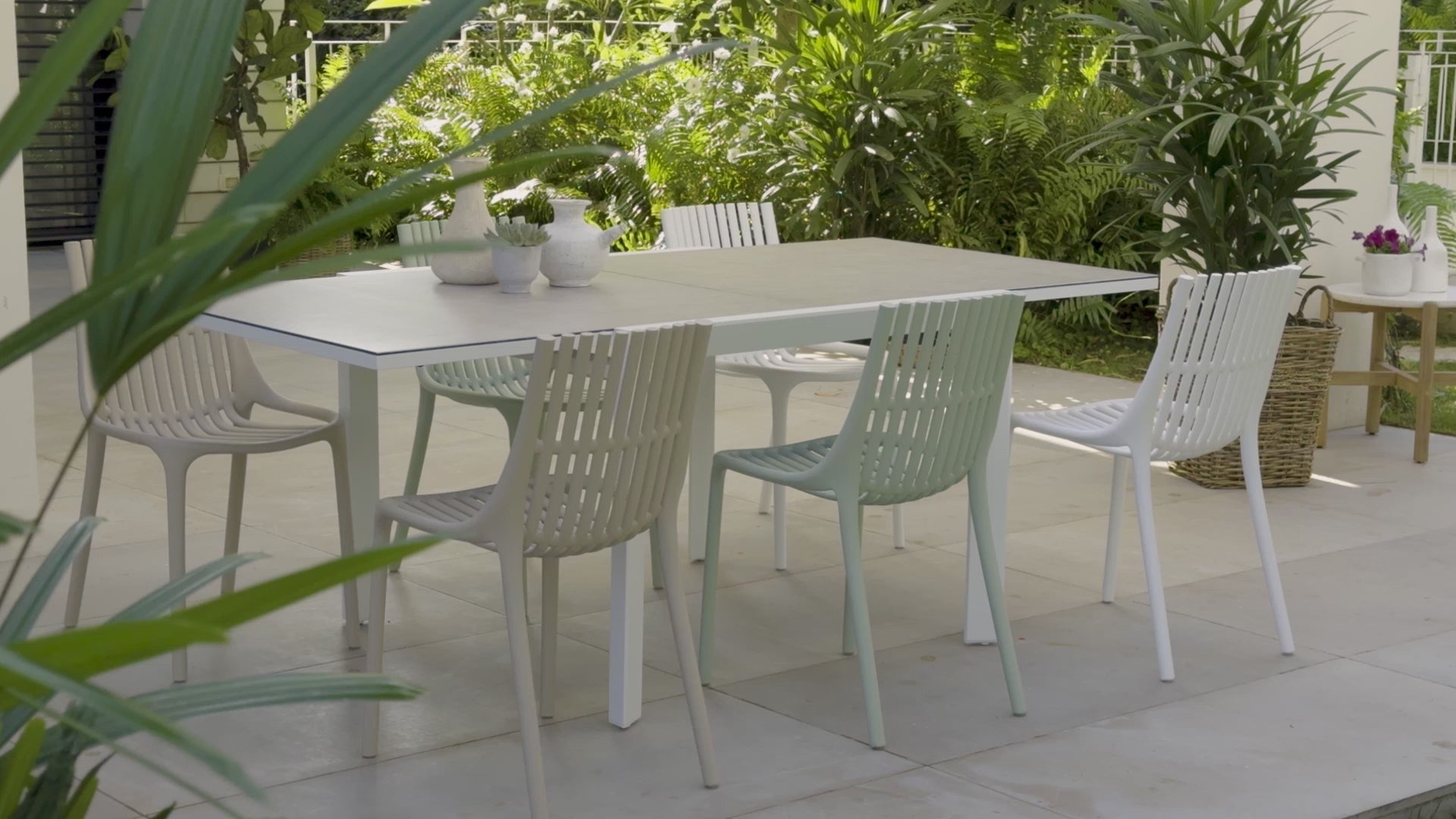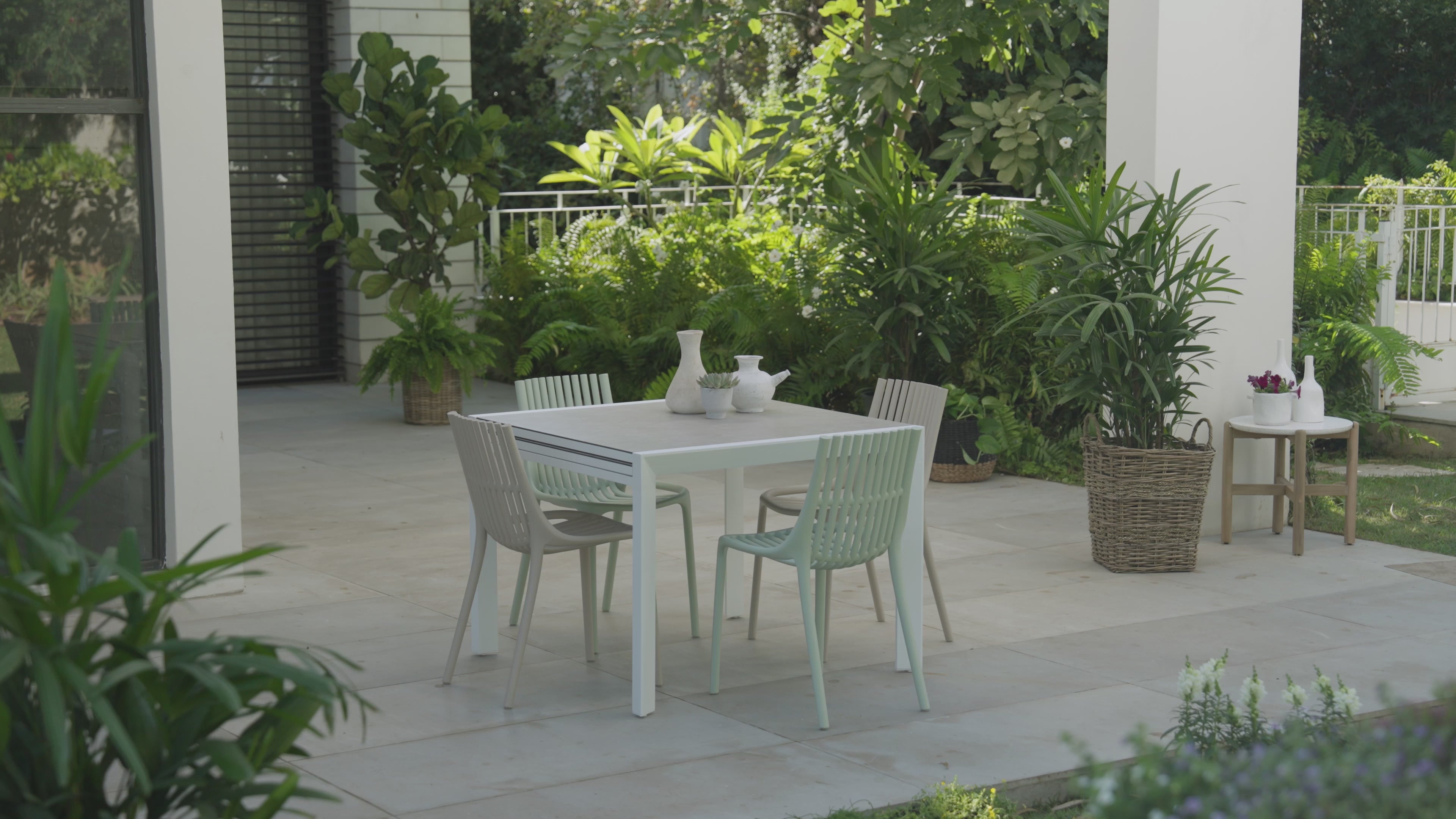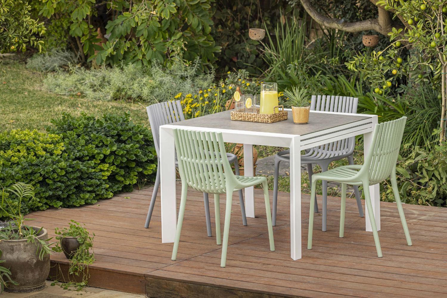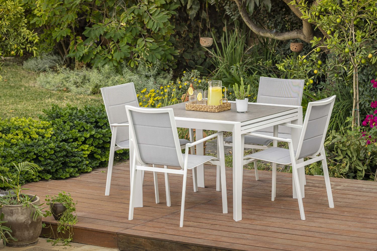 שולחן אוכל בעיצוב אלגנטי, מושלם לאירוח בגינה או במרפסת.