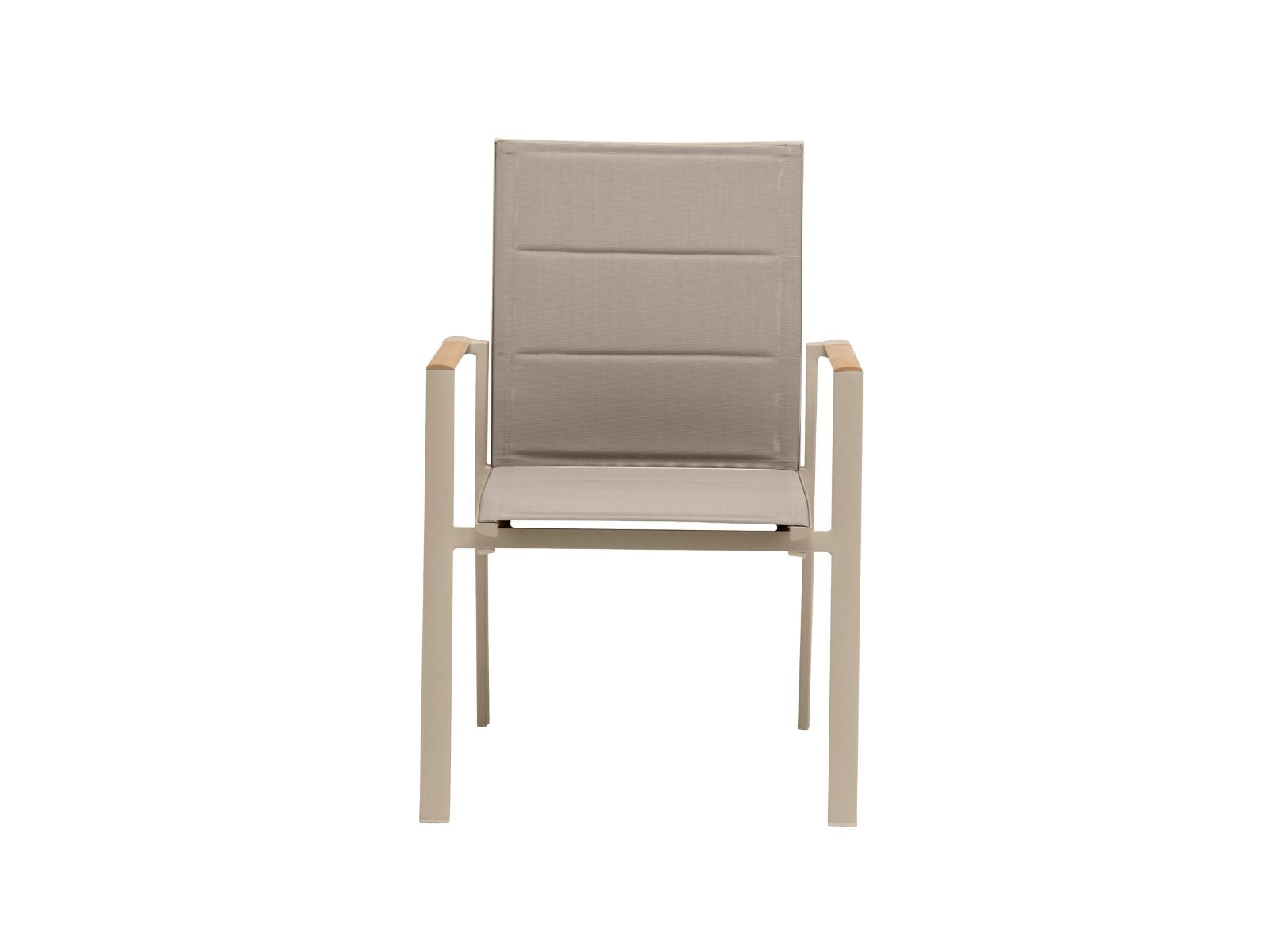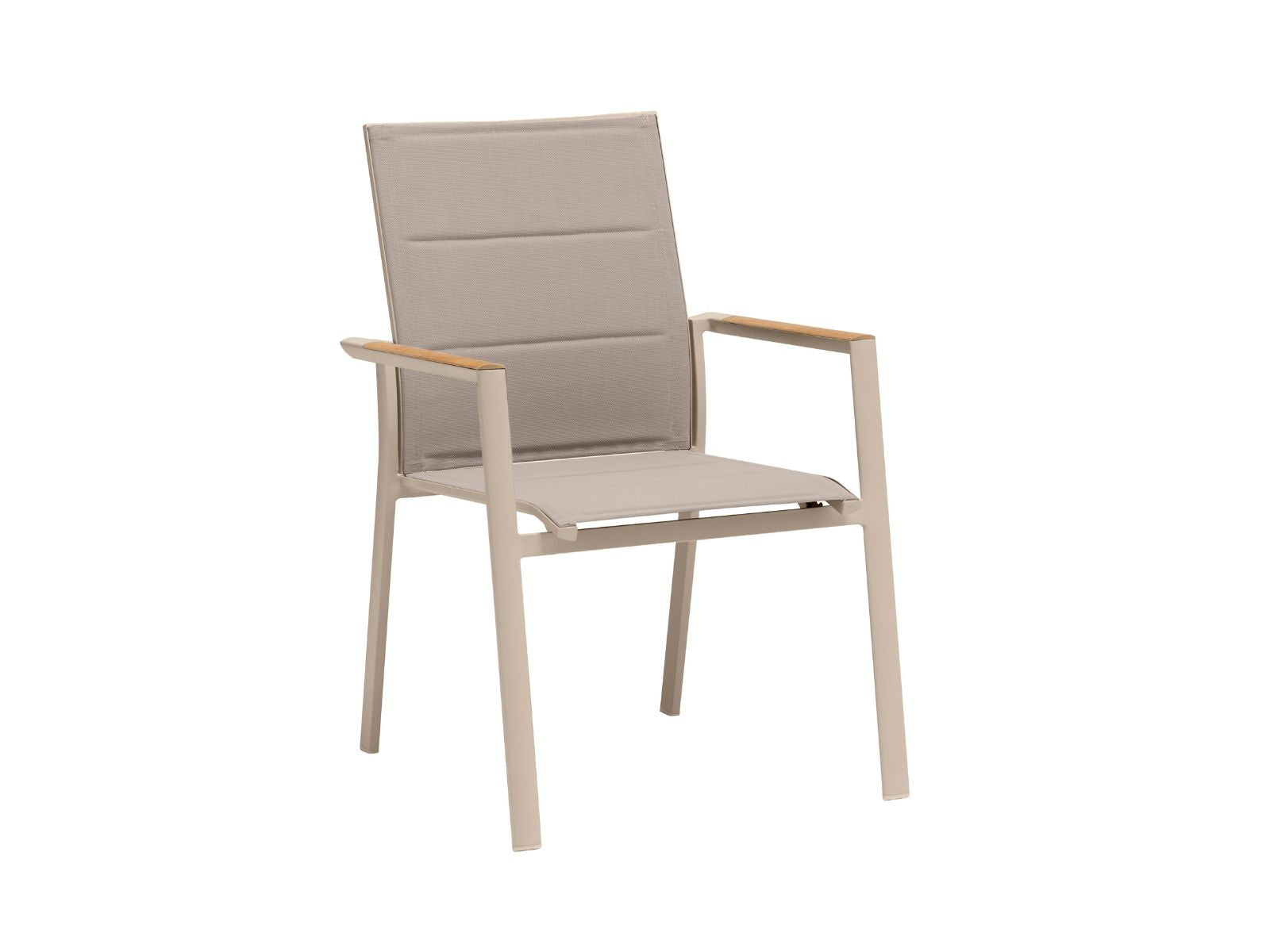כיסא מרווח ונח במיוחד עשוי שלדת אלומיניום, עם ידיות בשילוב עץ טיק, מושב וגב הכיסא עשויים בד רשת ארוג עמיד ונח לישיבה, קל לניקוי. כיסא קל משקל וניתן לערום אחד על גבי השני.