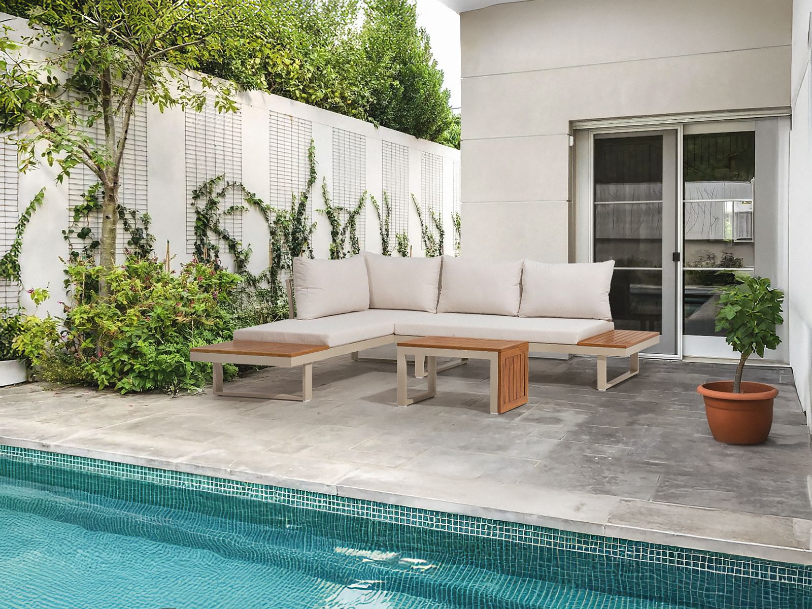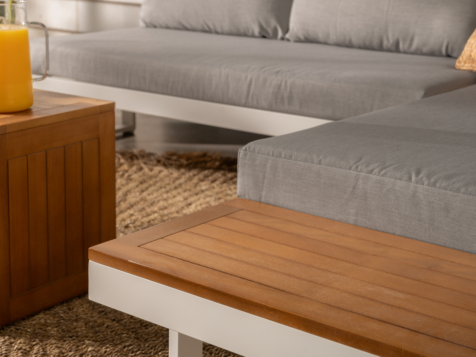מסגרת המערכת עשויה אלומיניום בשילוב עץ שיטה איכותי. כריות המושב והגב מרופדות בבד חוץ איכותי, עמיד ונעים למגע. המערכת כוללת: 2 ספות דו מושביות עם משטח עץ המשמש כשולחן צד, שולחן קפה קטן שניתן להציבו גם בצורה אנכית כמעמד למחשב, ספרים, כיבוד וכו'.