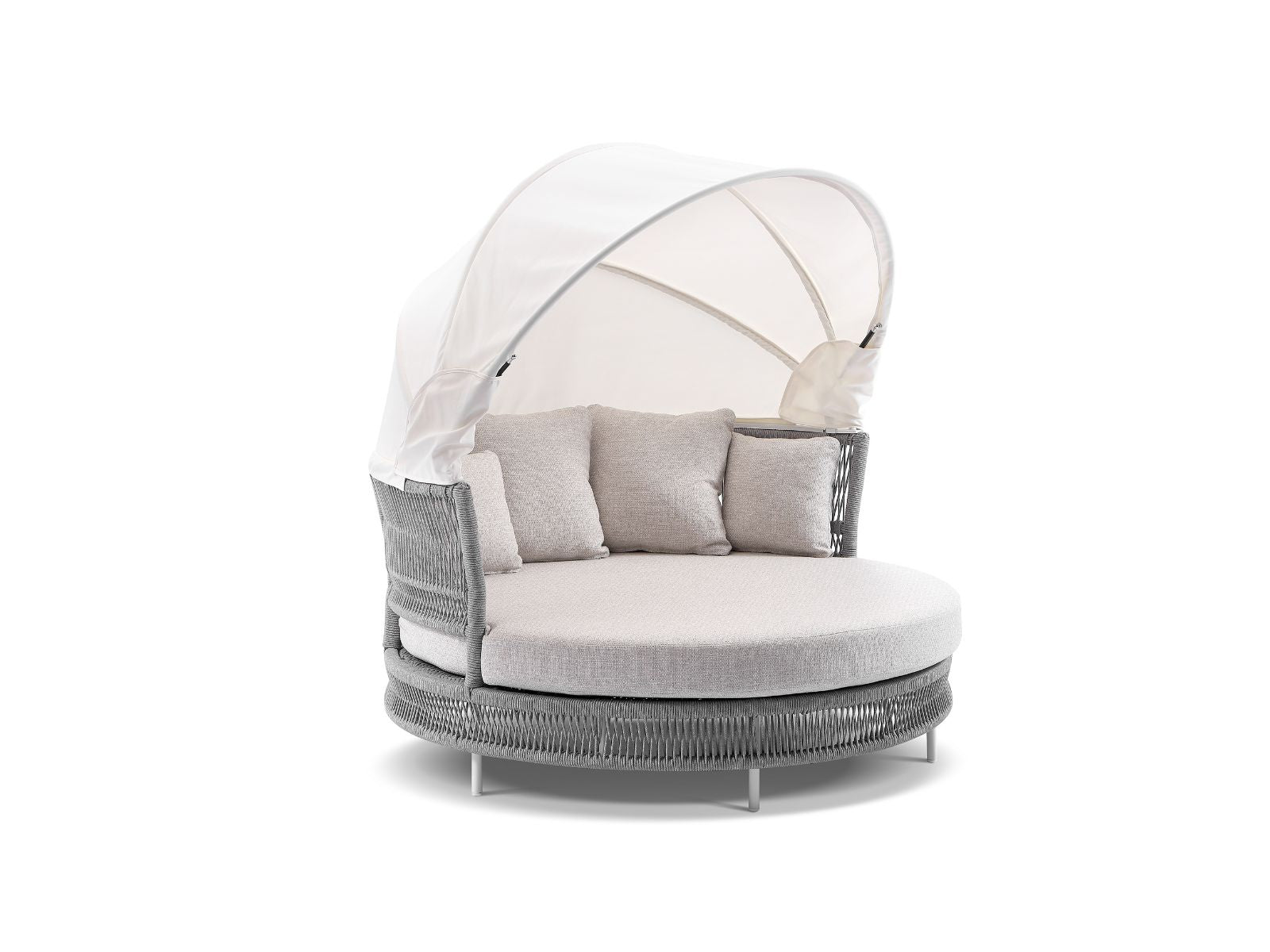 מרבץ עגול, רחב ומרופד עם גגון הצללה להגנה מהשמש המתכוונן וניתן לפתיחה וסגירה לפי הצורך.