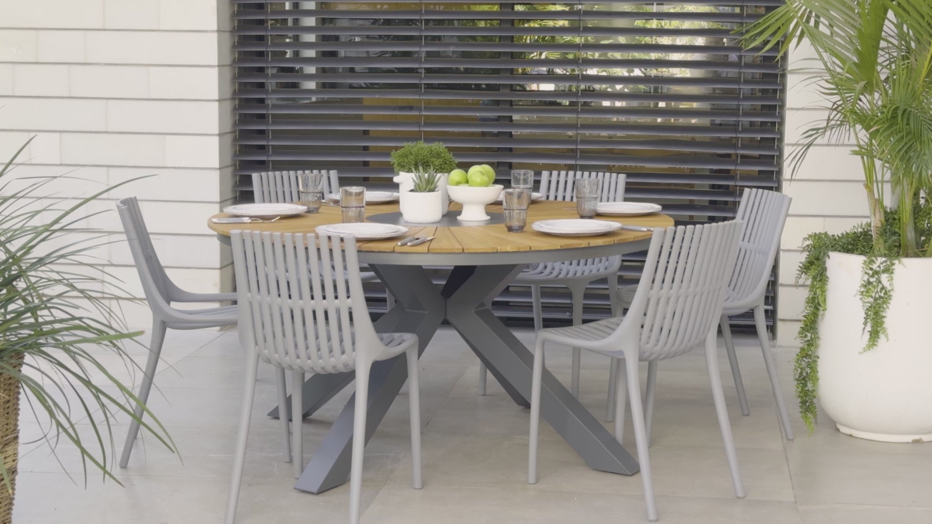 פינת אוכל הכוללת שולחן וכיסאות. שולחן אוכל קוטר 150 ס"מ מתאים לעד 7 סועדים. רגלי השולחן עשויות אלומיניום, משטח השולחן עשוי עץ טיק בורמזי איכותי עם חריצים דקים בשילוב אלומיניום.