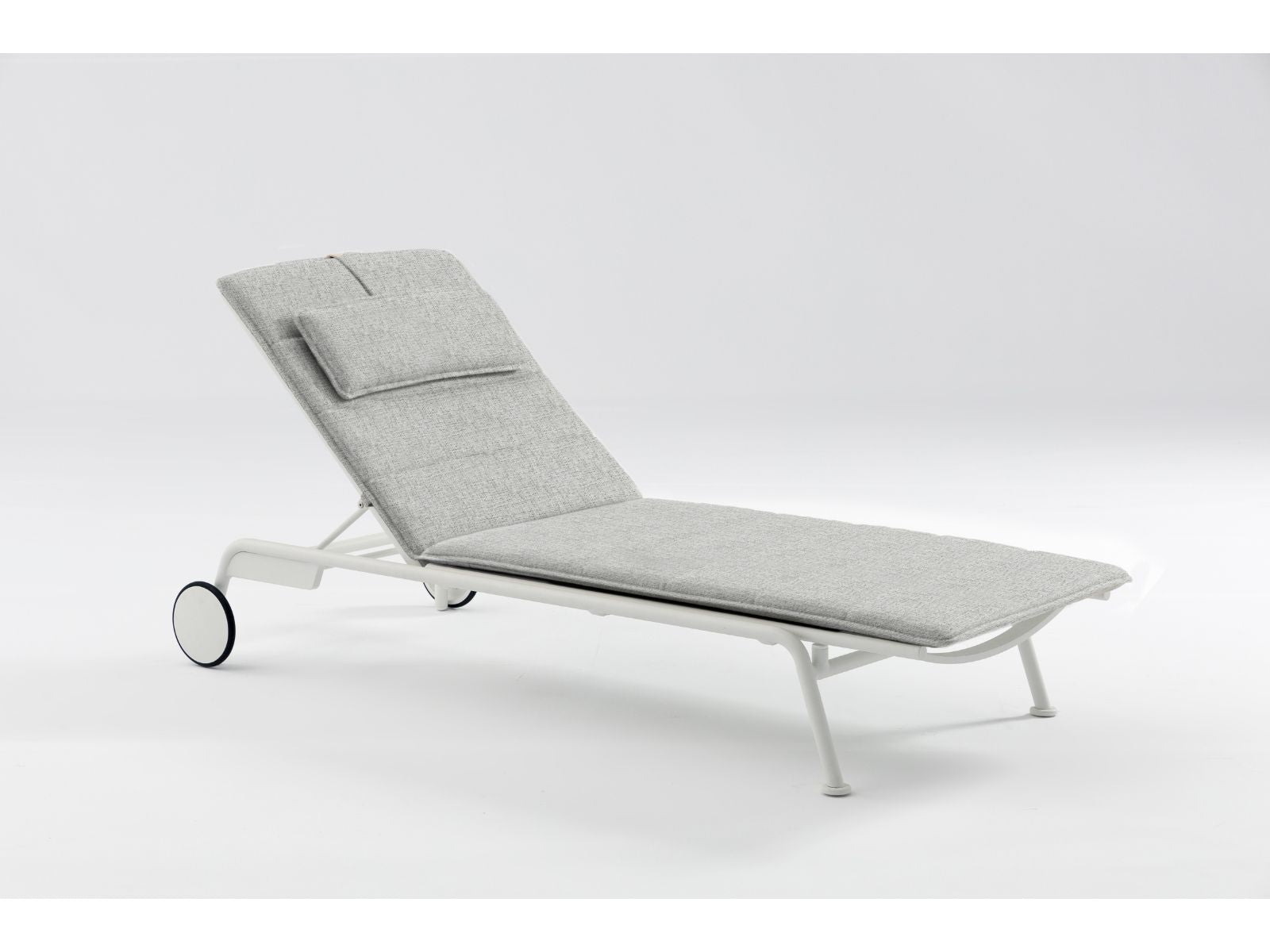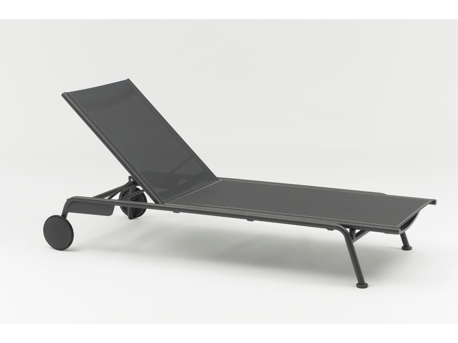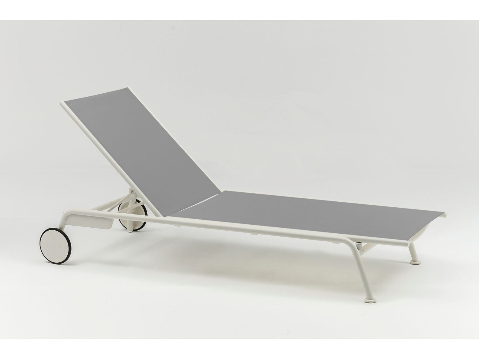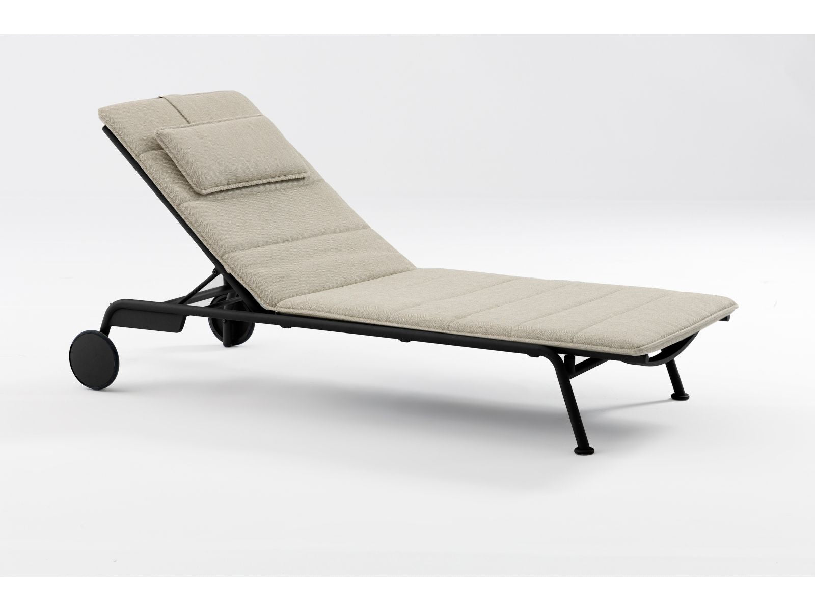 מיטת שיזוף מודרנית בעלת משענת גב מתכווננת וגלגלים המאפשרים לנייד אותה בקלות.
