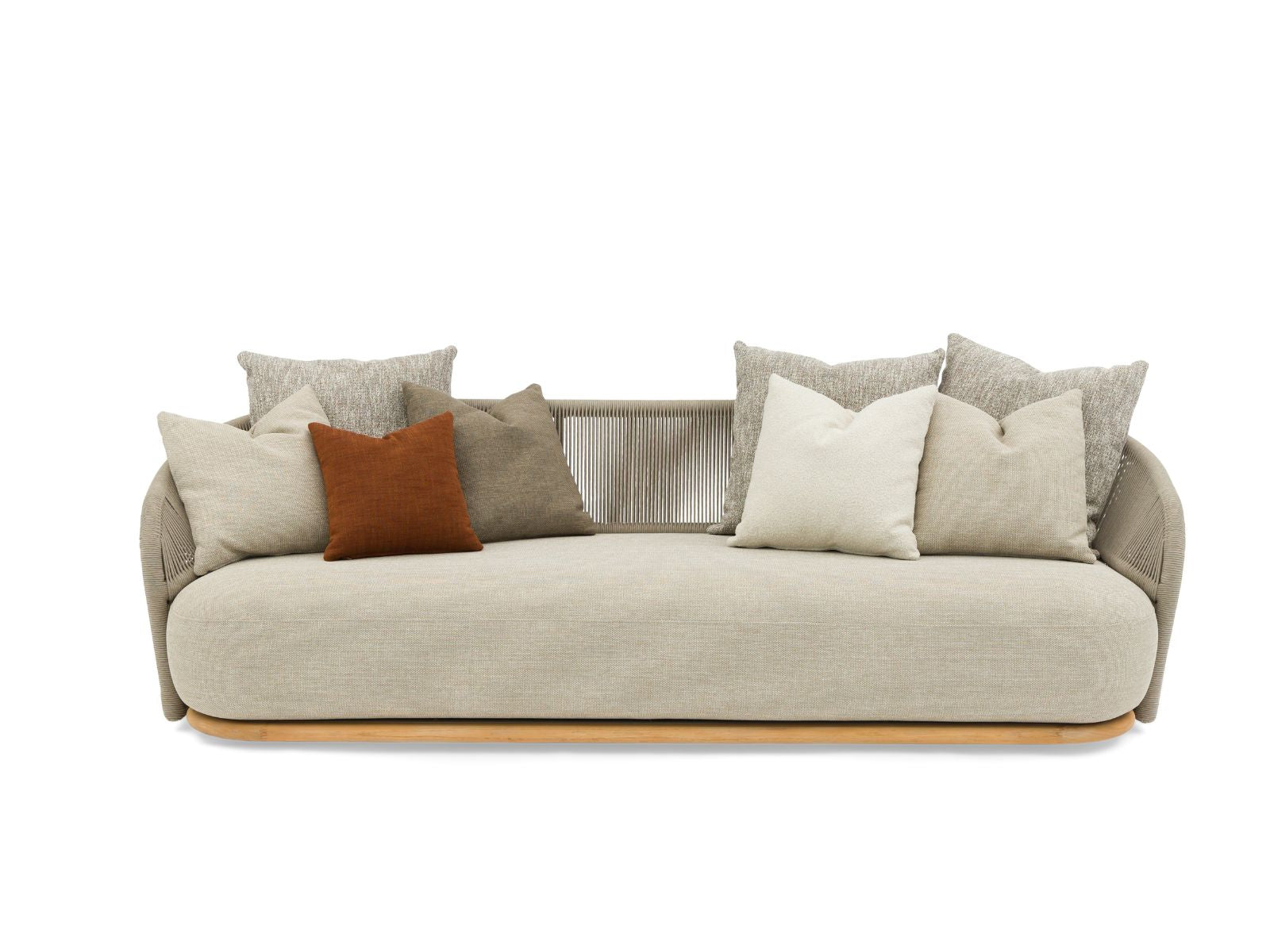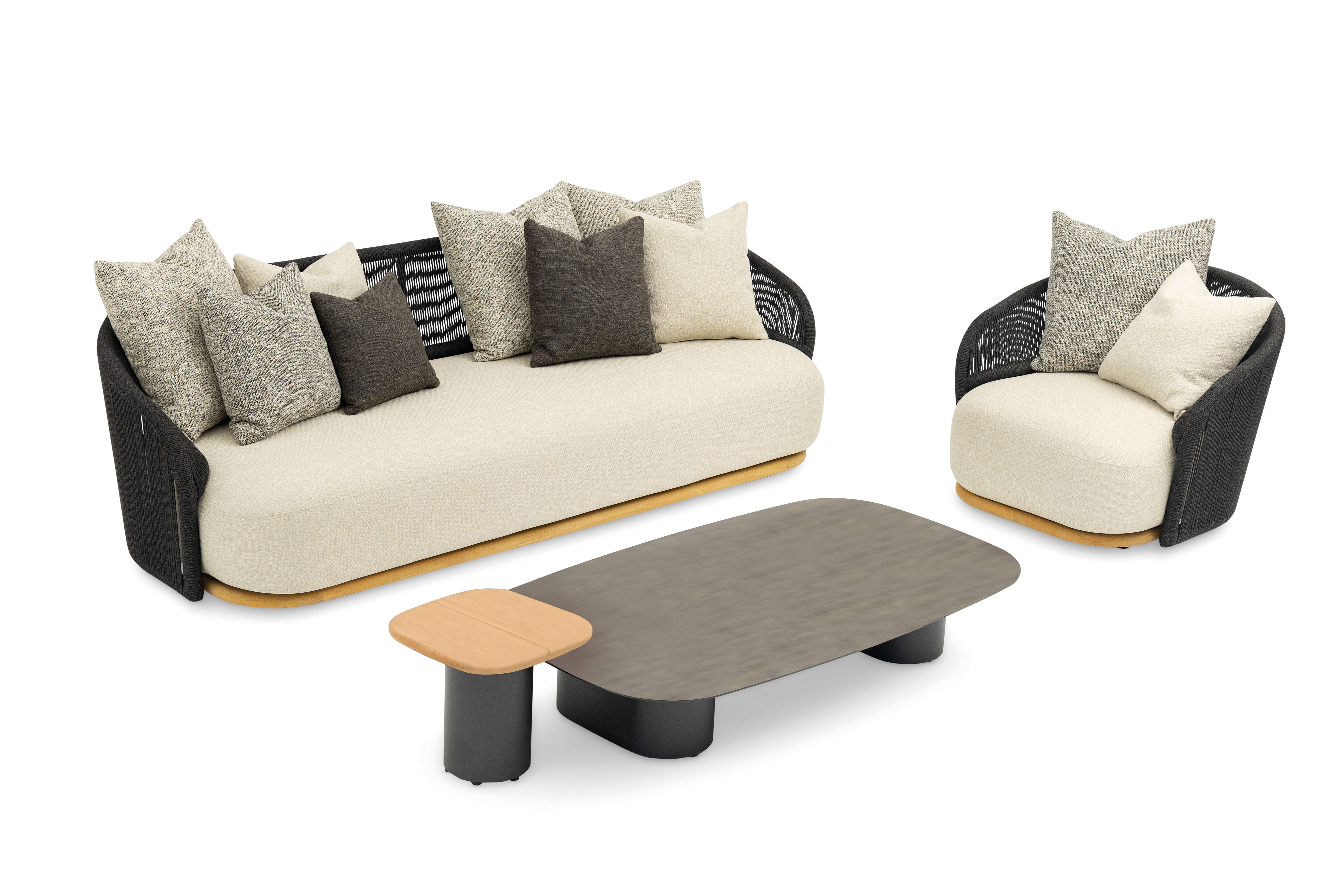 מערכת ישיבה מעוצבת בקווים רכים ומעוגלים שמזכירים את תנועת הגלים למראה נקי ונעים. המשענת דו־צדדית מחופה חבלים מוסיפה עומק ועניין ויוצרת עיצוב ייחודי ובולט.