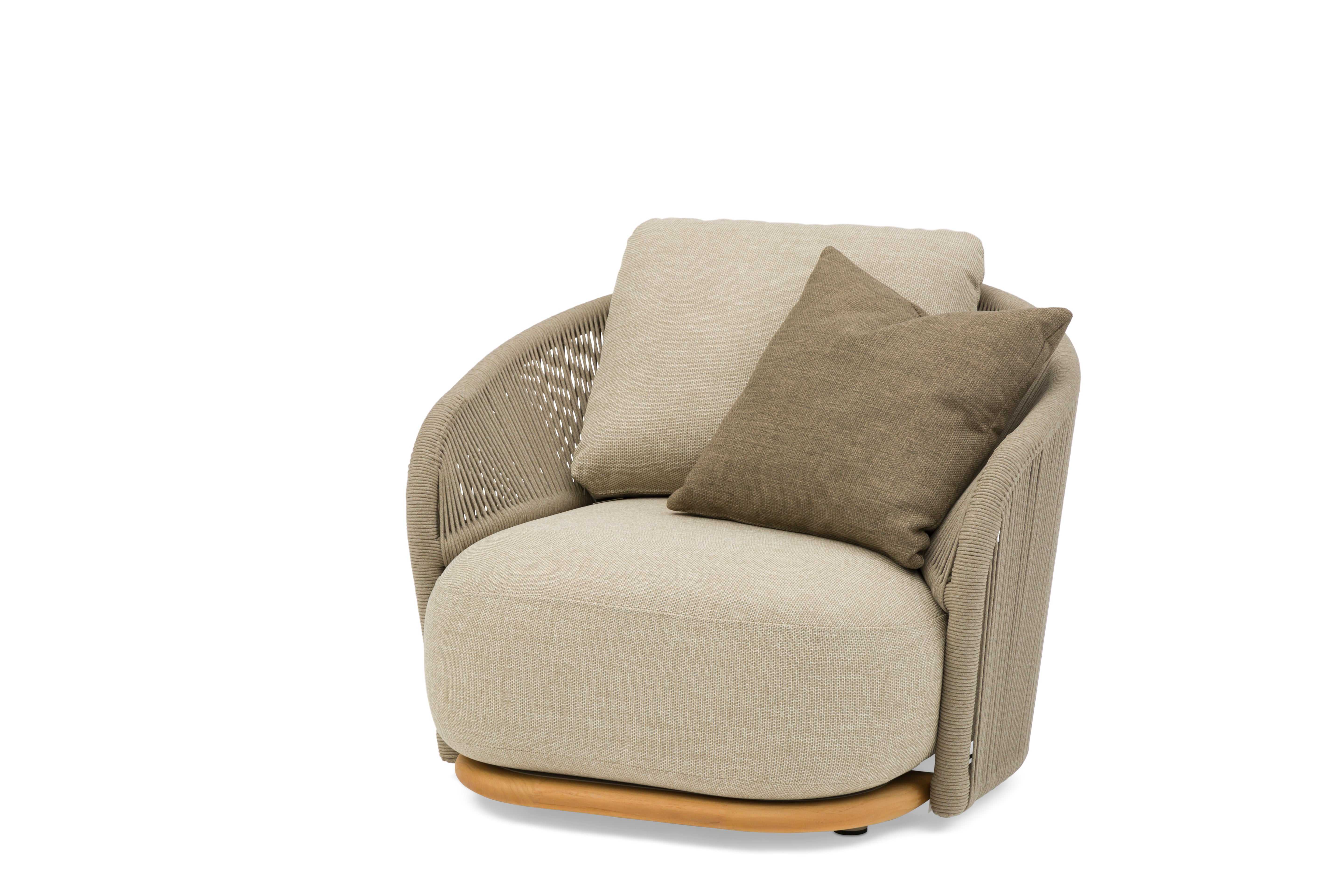 המערכת כוללת ספה תלת מושבית, כורסת יחיד וכורסת יחיד מסתובבת ושני שולחנות קפה תואמים, להשלמת מראה אחיד ומעוצב בחלל החוץ.