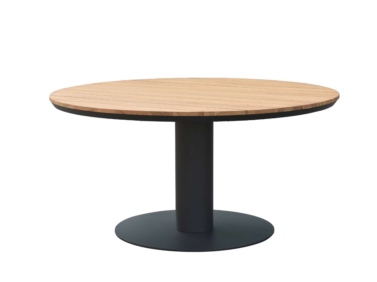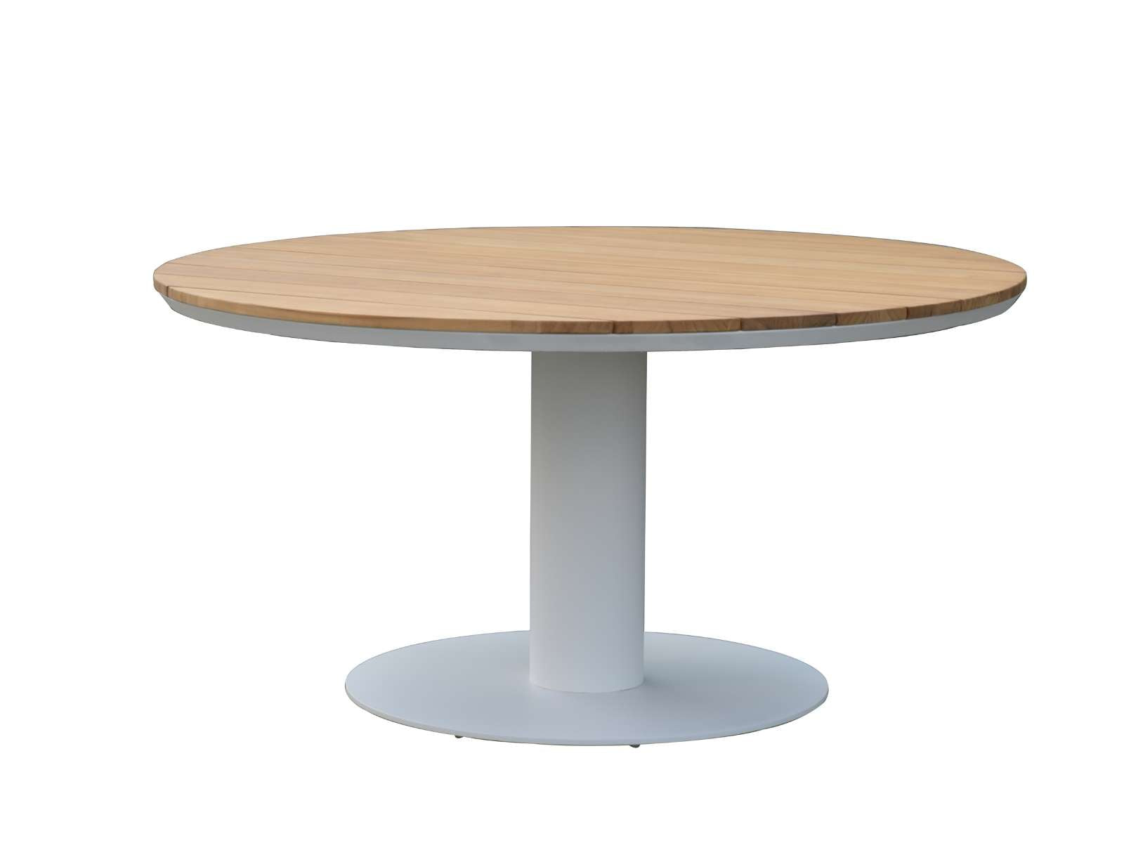 שולחן עגול בקוטר 150 ס"מ מתאים לעד 6 סועדים. רגל אמצע עשויה אלומיניום, משטח השולחן עשוי עץ טיק איכותי.
